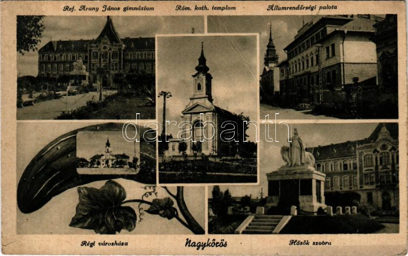 Beschreibung: 1944 Nagykőrös, Református Arany János gimnázium, Római katolikus templom, Államrendőrségi palota, Régi városháza, Hősök szobra (fa)