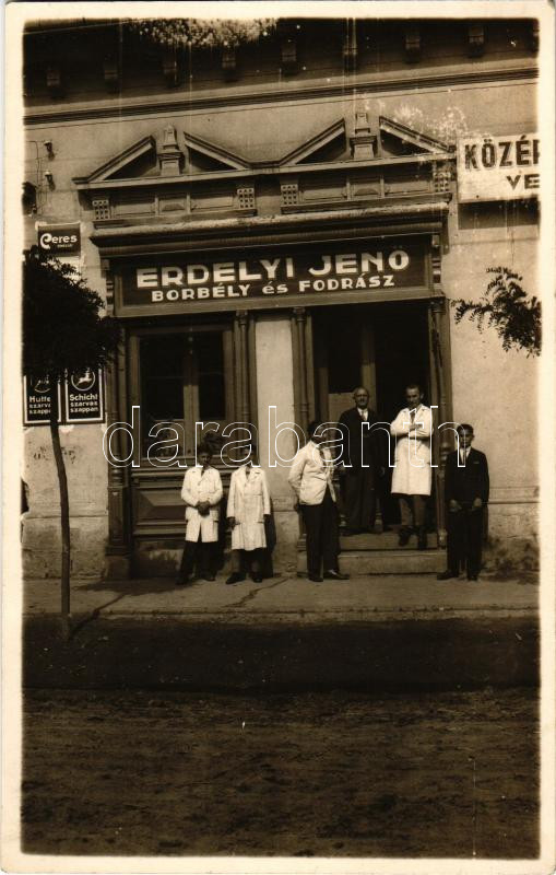 Beschreibung: Nyírbátor, Erdélyi Jenő borbély és fodrász üzlete a Hercz-féle házban. Tóth árpád fényképész, photo