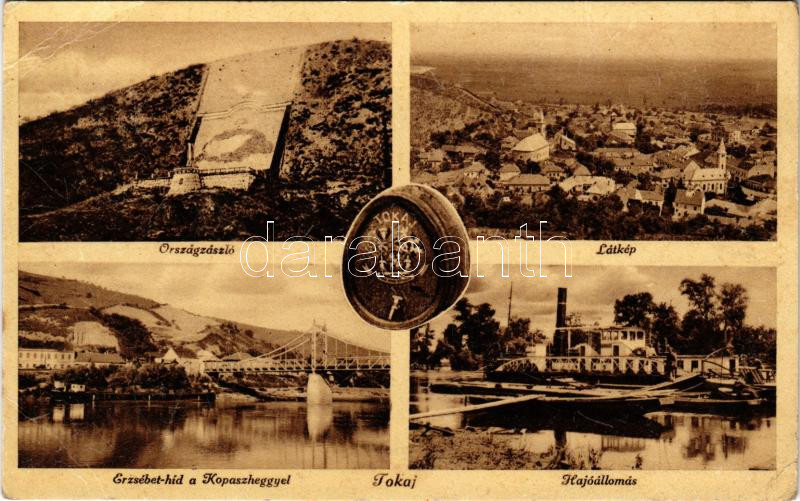 Beschreibung: Tokaj, Országzászló, irredenta propaganda, látkép, Erzsébet híd a Kopaszheggyel, Hajóállomás (EB)