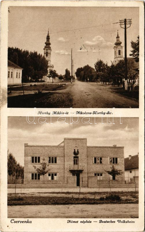 1942 Cservenka, Crvenka; Horthy Miklós út, Német népház / street, Germ... https://www.darabanth.com/de/473-Fernauktion/473.0/Ansichtskarten/Vojvodina~2000011/1942-Cservenka-Crvenka-Horthy-Miklos-ut-Nemet-nephaz-street-German-national-house-EK~II3212164