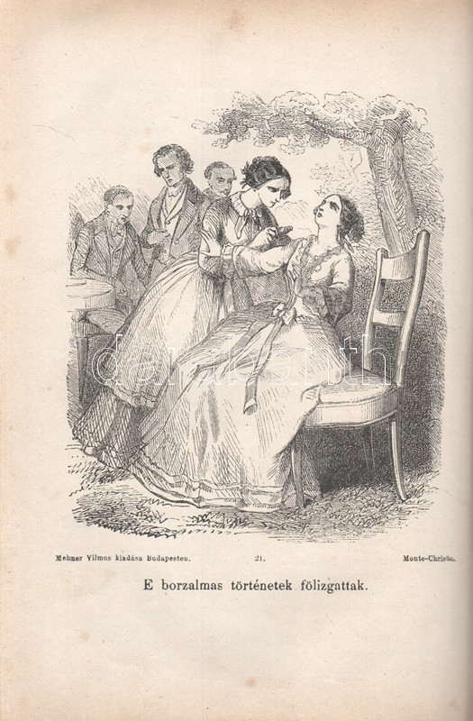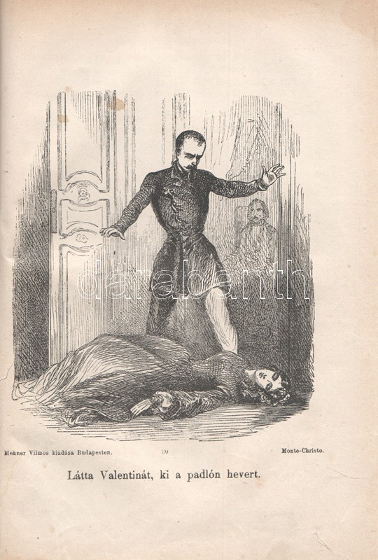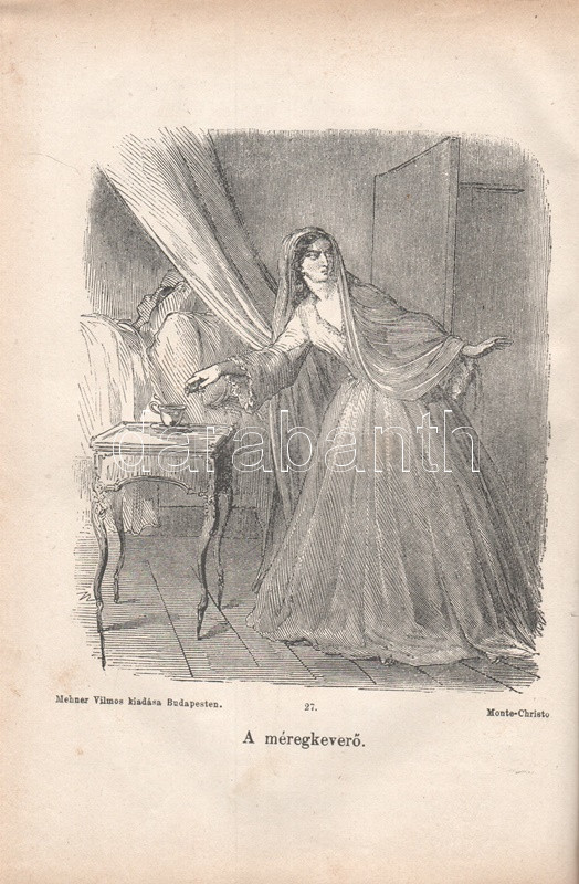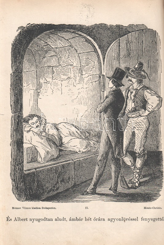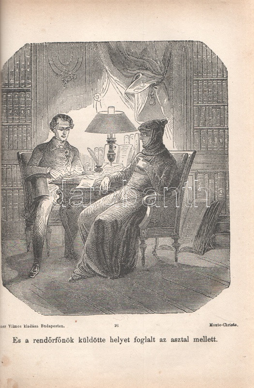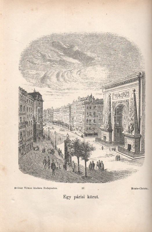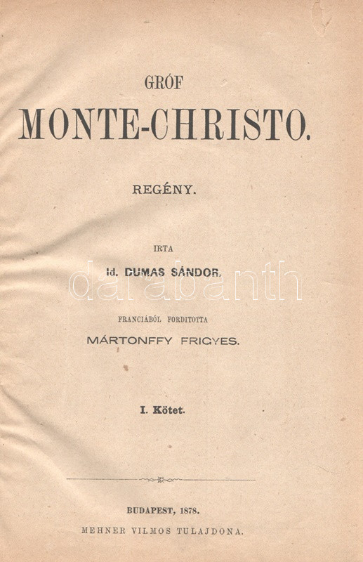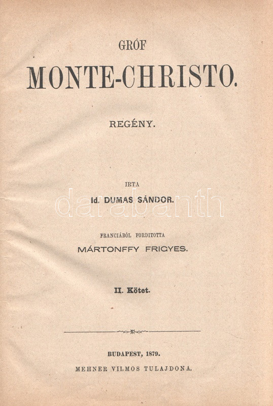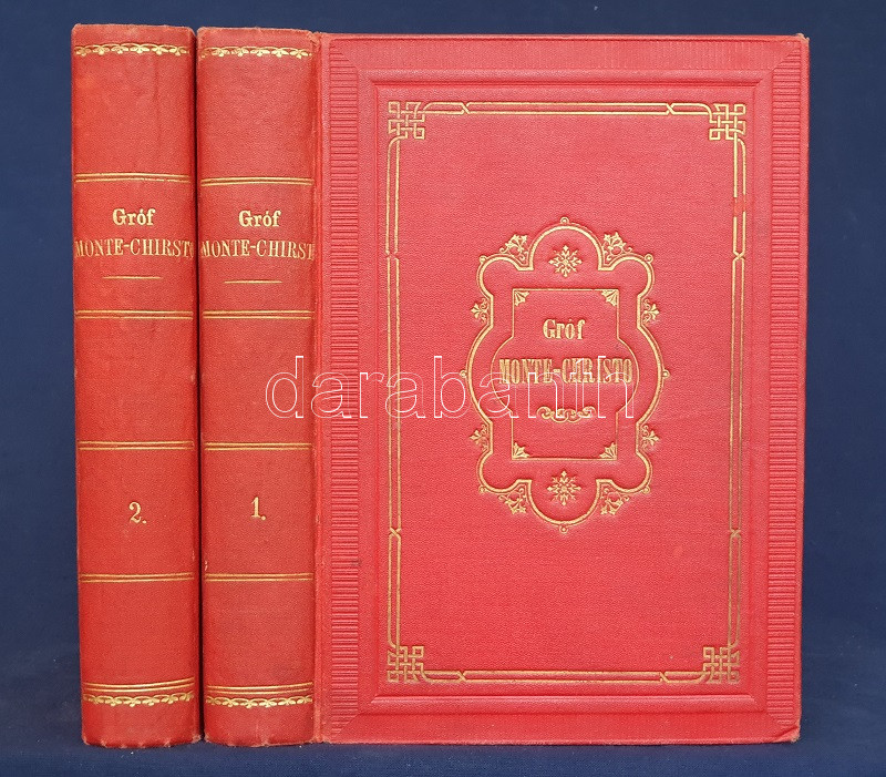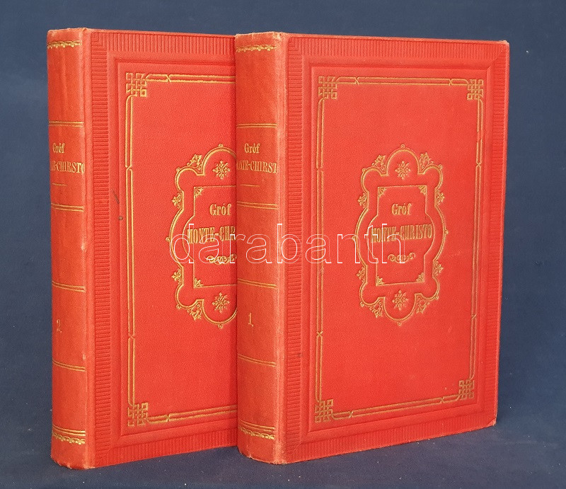 Dumas, [Alexandre] Sándor: Gróf Monte-Christo. Regény. Írta Dumas Sándor. Franciából fordította Mártonffy Frigyes. I-II. kötet. [Teljes, két kötetben.] Budapest, 1878-1879. Mehner Vilmos (Rudnyánszky A. ny.) 1 t. (címkép) + 692 + [2] p. + 12 t.; 726 + [2] p. + 14 t. Alexandre Dumas (1802-1870) klasszikus kalandregénye a műfaj egyik legnagyobb, máig meghatározónak számító teljesítménye. A ,,Monte Cristo grófja" néven ismert történetfolyam valójában két szerző közös műve: a már befutott és valóságos írói műhelyt fenntartó Alexandre Dumas szerzőtársára, Auguste Maquet-re bízta a regény cselekményvázlatának kidolgozását, ám a munka nagyját, a jeleneteket és a párbeszédeket Dumas dolgozta ki. A mű eredeti nyelven először 1844-1846 között jelent meg, folytatásokban, és egyike a legtöbbször lefordított regényeknek. Magyar nyelven először 1861-1862-ben jelent meg, Veszprémben, Cholnoky László fordításában, hat kötetben, melyet két budapesti fordítás követett: a Rózsa Kálmán és Neje kiadónál megjelenő népies változat, ,,Monte-Christo grófnak csodás története. Igen szép és mulattató elbeszélés" címmel (1878), valamint a Mártonffy Frigyes által fordított, illusztrált, két kötetes változat (1878-1879). A kalandregény azóta is számos új fordításban, átdolgozásban és adaptálásban látott napvilágot; készült belőle film, filmsorozat, képregény, színdarab és musical; csupán a filmtörténet hét filmváltozatot ismer belőle. A második kötet három levelének szélén apró pótlás, néhány levélen apró szakadásnyom, néhány oldalon és táblán apró foltosság. Egységes, aranyozott, vaknyomásos korabeli egészvászon kötésben, aranyozott festésű lapszélekkel. Szép példány, nagyon ritka kiadás.