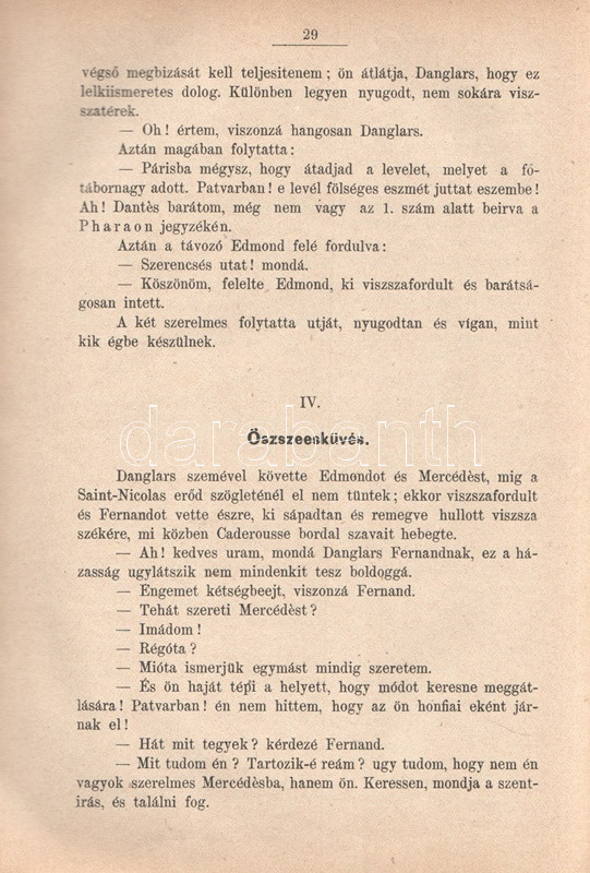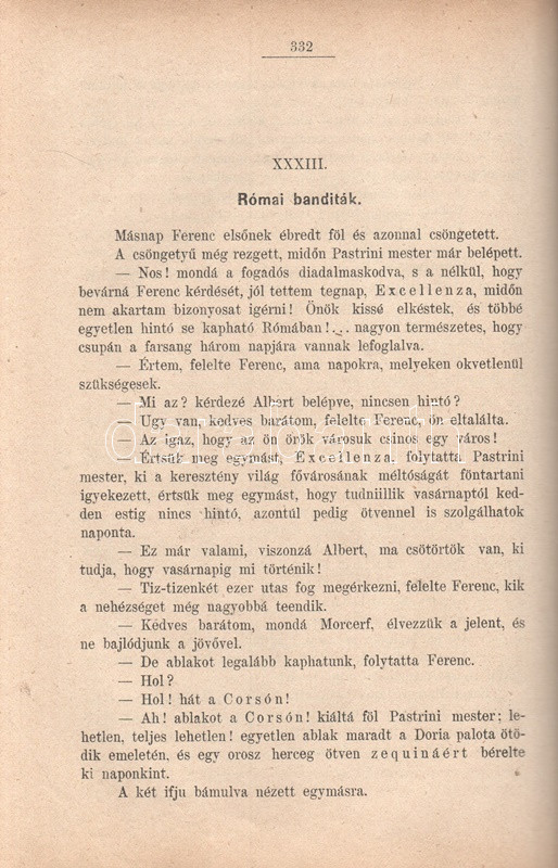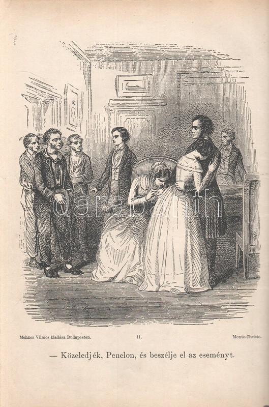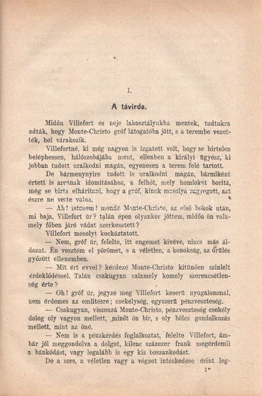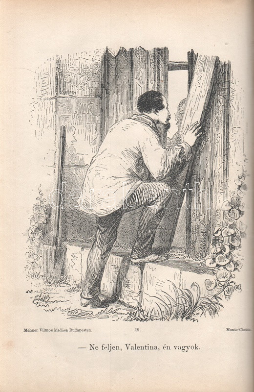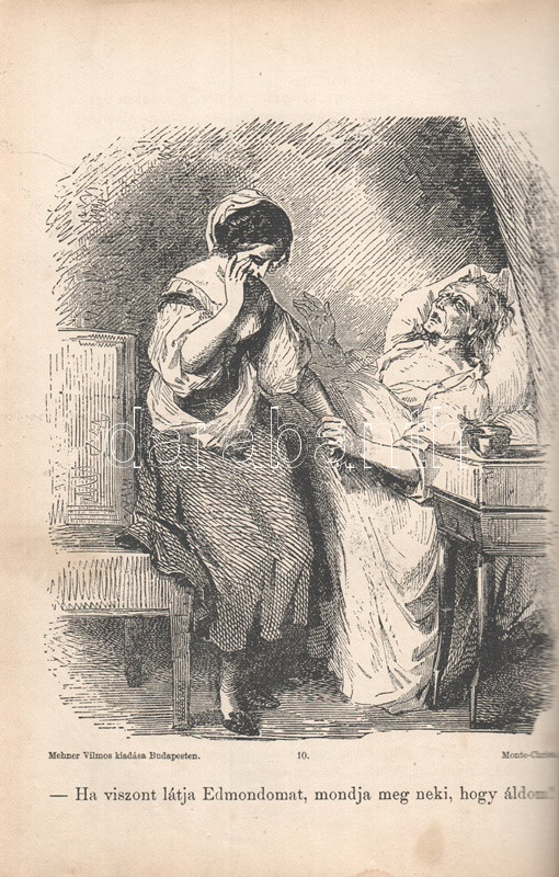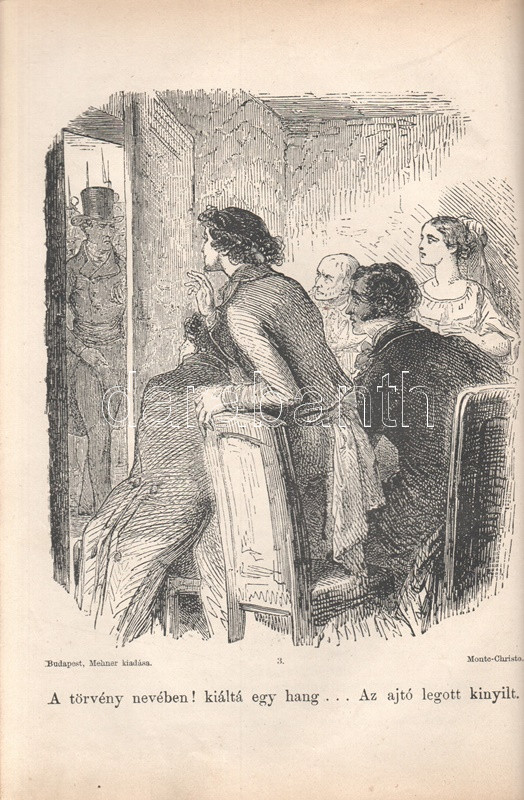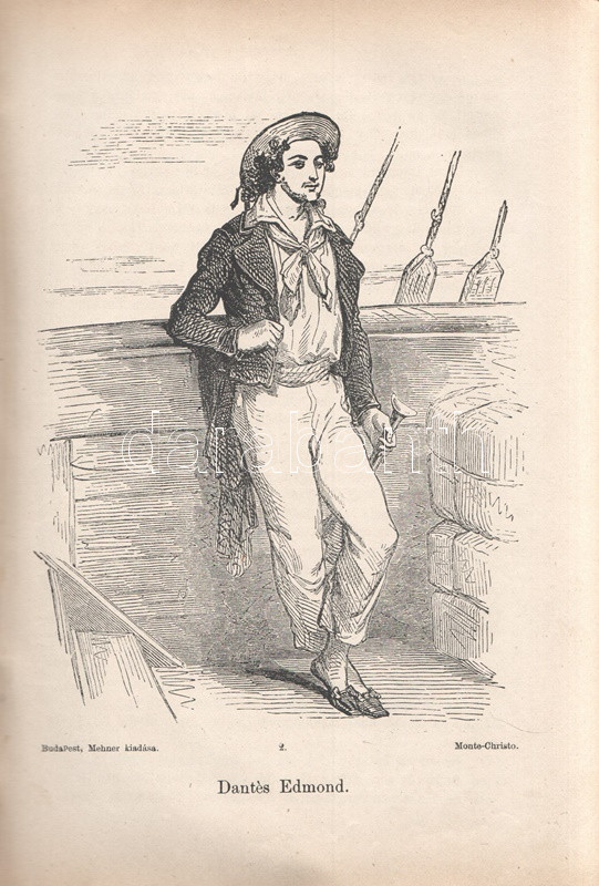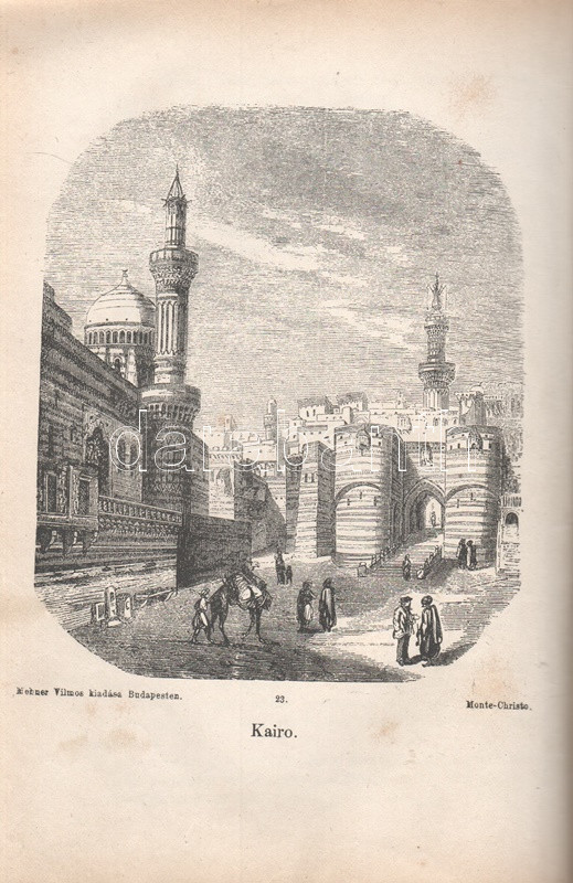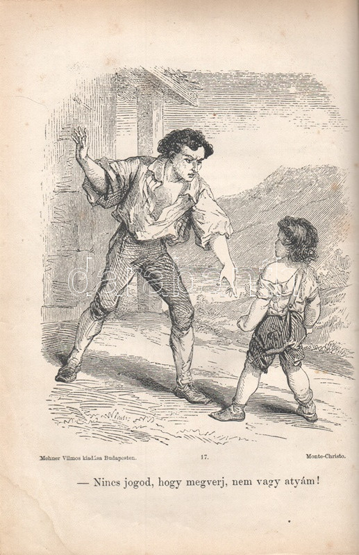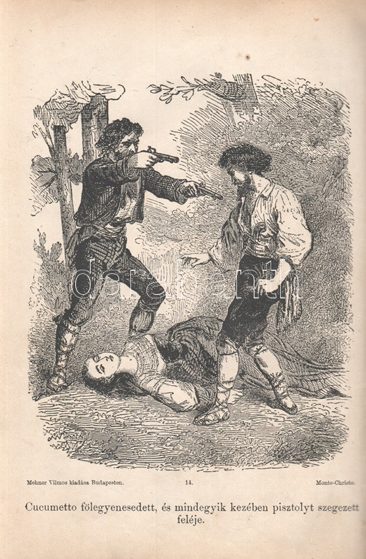 Dumas, [Alexandre] Sándor: Gróf Monte-Christo. Regény. Írta Dumas Sándor. Franciából fordította Mártonffy Frigyes. I-II. kötet. [Teljes, két kötetben.] Budapest, 1878-1879. Mehner Vilmos (Rudnyánszky A. ny.) 1 t. (címkép) + 692 + [2] p. + 12 t.; 726 + [2] p. + 14 t. Alexandre Dumas (1802-1870) klasszikus kalandregénye a műfaj egyik legnagyobb, máig meghatározónak számító teljesítménye. A ,,Monte Cristo grófja" néven ismert történetfolyam valójában két szerző közös műve: a már befutott és valóságos írói műhelyt fenntartó Alexandre Dumas szerzőtársára, Auguste Maquet-re bízta a regény cselekményvázlatának kidolgozását, ám a munka nagyját, a jeleneteket és a párbeszédeket Dumas dolgozta ki. A mű eredeti nyelven először 1844-1846 között jelent meg, folytatásokban, és egyike a legtöbbször lefordított regényeknek. Magyar nyelven először 1861-1862-ben jelent meg, Veszprémben, Cholnoky László fordításában, hat kötetben, melyet két budapesti fordítás követett: a Rózsa Kálmán és Neje kiadónál megjelenő népies változat, ,,Monte-Christo grófnak csodás története. Igen szép és mulattató elbeszélés" címmel (1878), valamint a Mártonffy Frigyes által fordított, illusztrált, két kötetes változat (1878-1879). A kalandregény azóta is számos új fordításban, átdolgozásban és adaptálásban látott napvilágot; készült belőle film, filmsorozat, képregény, színdarab és musical; csupán a filmtörténet hét filmváltozatot ismer belőle. A második kötet három levelének szélén apró pótlás, néhány levélen apró szakadásnyom, néhány oldalon és táblán apró foltosság. Egységes, aranyozott, vaknyomásos korabeli egészvászon kötésben, aranyozott festésű lapszélekkel. Szép példány, nagyon ritka kiadás.