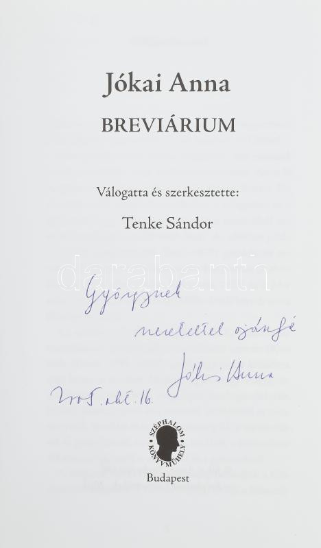 Jókai Anna: Breviárium. (Dedikált!) Vál. és szerk.: Tenke Sándor. Bp., 2005, Széphalom Könyvműhely. Első kiadás. Kiadói aranyozott műbőr-kötés. A szerző, Jókai Anna (1932-2017), a Nemzet Művésze címmel kitüntetett, kétszeres Kossuth-díjas és József Attila-díjas író- és költőnő által dedikált példány.
