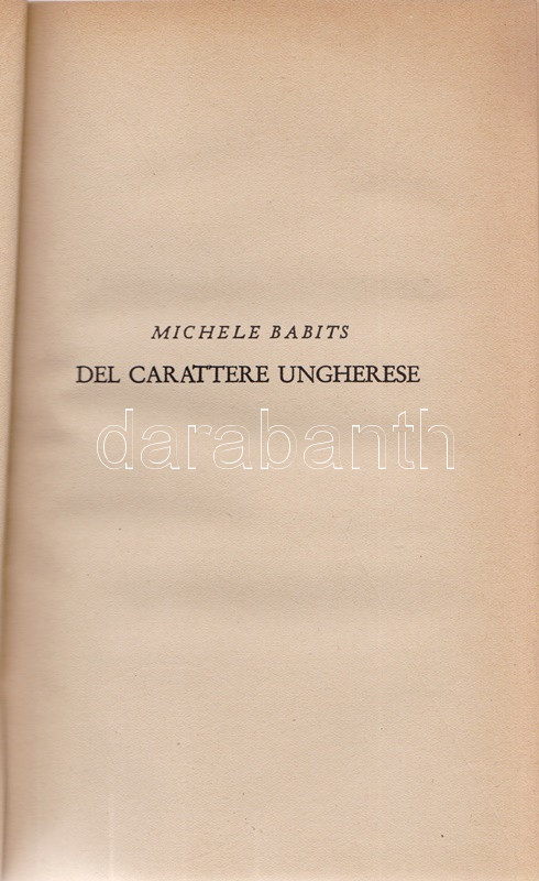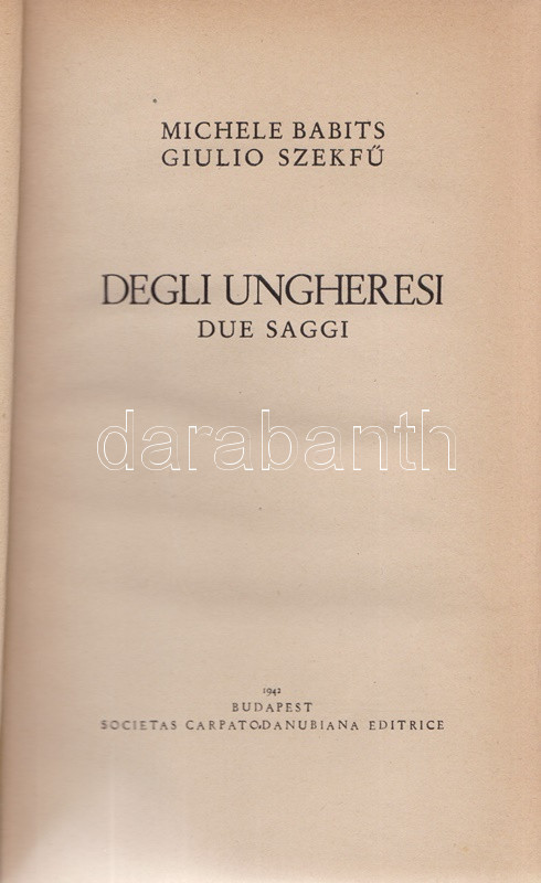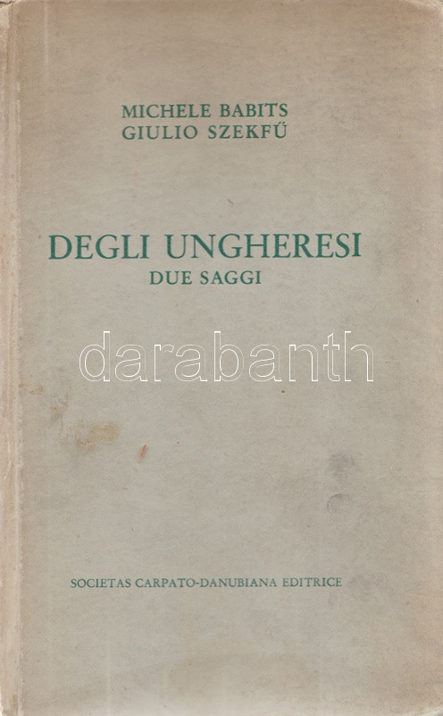 Babits [Mihály], Michele - Szekfű [Gyula], Giulio: Degli ungheresi. Due saggi. Budapest, 1942. Societas Carpato-Danubiana Editrice (S. A. ,,Athenaeum''). 142 p. Egyetlen kiadás. A nemzetkarakterológiai kötetben Babits Mihály: ,,Del carattere ungherese'' című esszéjét Szekfű Gyula ,,Il carattere ungherese nella storia'' tanulmánya követi. A tanulmányok eredeti nyelven először a Szekfű Gyula szerkesztette ,,Mi a magyar?'' című kötetben jelentek meg, 1939-ben. (Biblioteca di ,,Rassegna d'Ungheria''. Serie prima. N. 1-2.) Enyhén foltos kiadói kartonkötésben. Jó példány.
