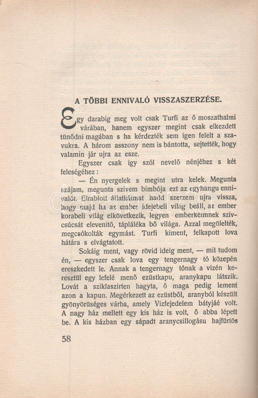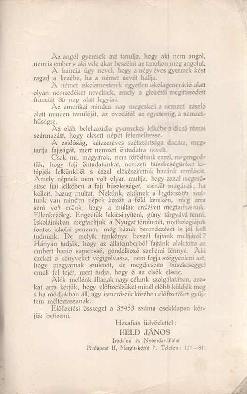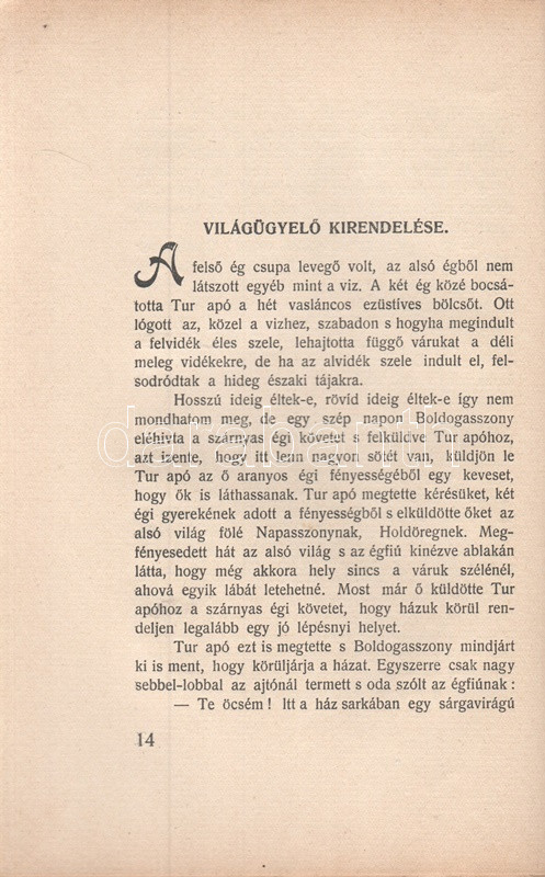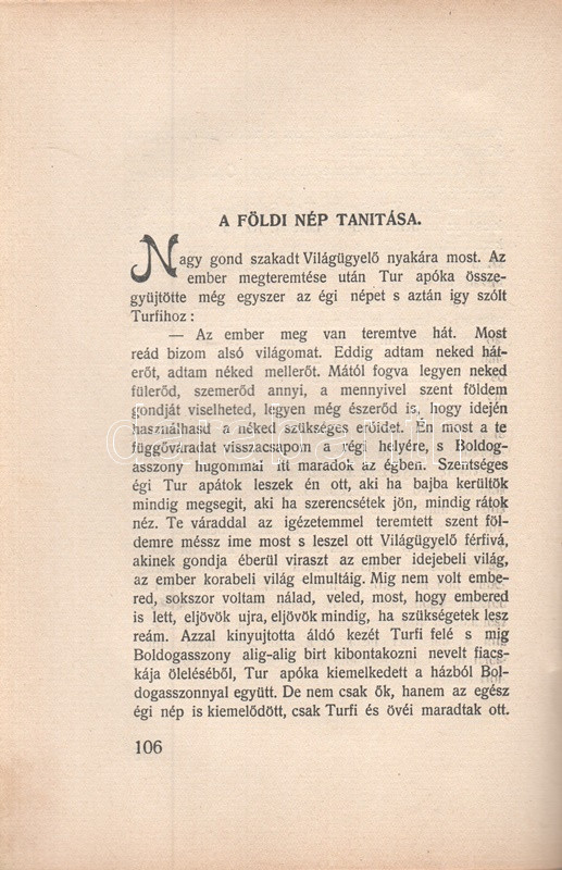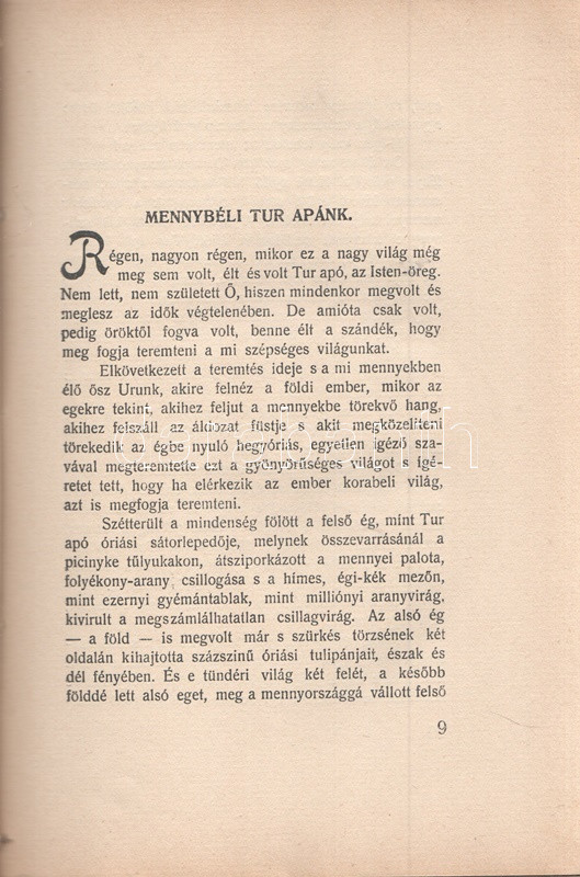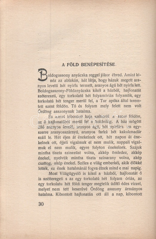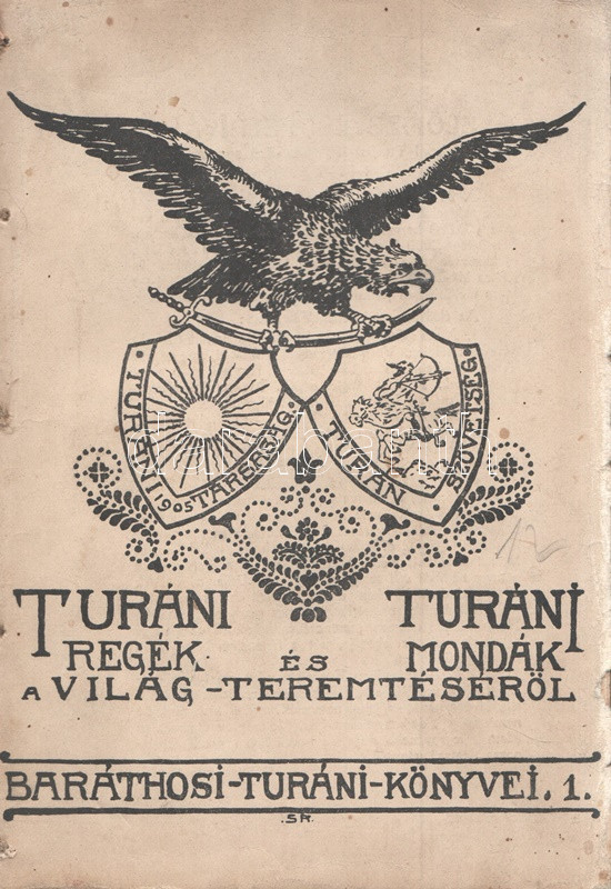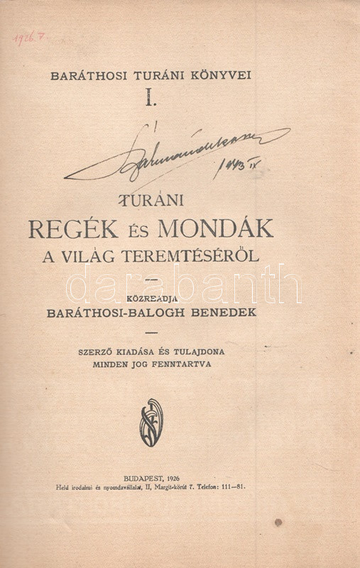 Baráthosi Balogh Benedek: Turáni regék és mondák a világ teremtéséről. Budapest, 1926. Szerző (Held János Irodalmi és Nyomdavállalat). 159 + [1] p. Első kiadás. Baráthosi-Balogh Benedek (1870-1945) néprajzkutató, Ázsia-utazó, őstörténeti író. 1908-tól több alkalommal bejárta Kelet- és Közép-Ázsia számos táját, mindannyiszor a magyarság turáni kapcsolatait kutatva. 1926-ban megkezdett turáni könyvsorozatával a magyarság finn-ugor, türk és még távolabbi rokonainak régen elfeledett közös hitvilágát, erkölcsi alaptermészetét kívánta rekonstruálni, illetve jelenlegi életmódját bemutatni. A sorozat bevezető kötetének előszavában amellett érvel a szerző, hogy a magyarság a trianoni veszteséget döntően annak köszönheti, hogy nem ismeri fel néphagyományaiba kódolt nagyságát. A szerző a néphagyomány utáni kutatásában nagy fantáziával alkotja meg egy sztyeppei nép mondavilágát, Túr apóval, a világ teremtőjével, a moszathalmi Túrfival, a Világügyelővel, az örök ellenség Ördöng anyóval, Hollóöreg szörnyeteggel, aki szintén a fő hős Túrfi ellenfelei számát gyarapítja; Boldogasszony Földanyával, Mackó kisasszonnyal és egyéb mitológiai szereplőkkel. A címlapon régi tulajdonosi bejegyzés. (Baráthosi turáni könyvei. I. kötet.) Fűzve, illusztrált, zsinórral erősített gerincű kiadói borítóban. Körülvágatlan példány.