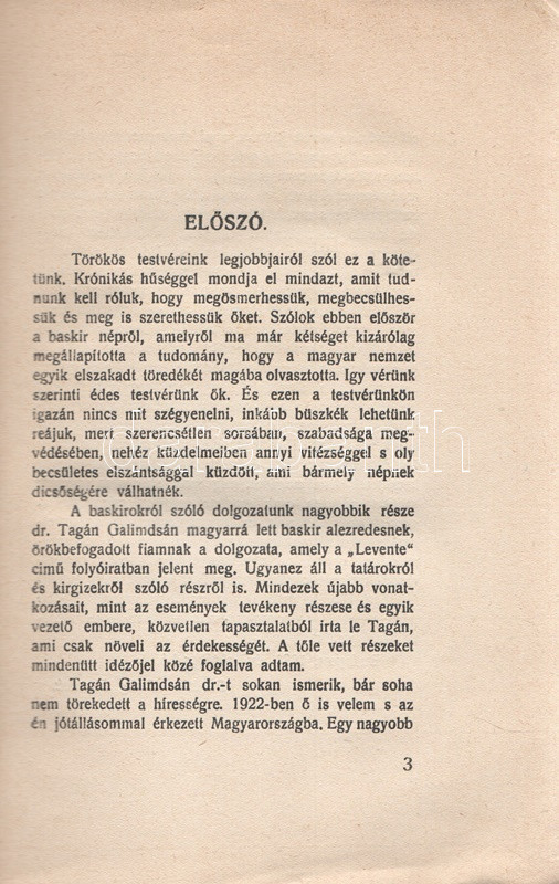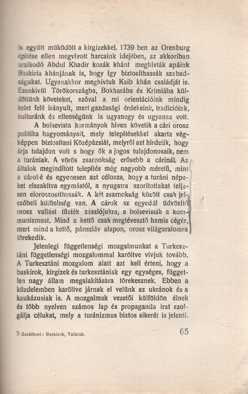 Baráthosi-Balogh Benedek: Baskírok, tatárok. Budapest, 1932. Szerző - Held János Irodalmi és Nyomdavállalat. 160 + [2] p. Első kiadás. Baráthosi-Balogh Benedek (1870-1945) néprajzkutató, Ázsia-utazó, őstörténeti író. 1908-tól több alkalommal bejárta Kelet- és Közép-Ázsia számos táját, mindannyiszor a magyarság turáni kapcsolatait kutatva. Turáni köteteiben főképpen belső-, dél-, és kelet-ázsiai utazásain gyűjtött élményei alapján következtet az ősmagyarság turáni eredetére, könyvsorozatának jelen, tizenhatodik kötetében azonban nem annyira a magyarság turáni kapcsolatait vizsgálja, hanem a két, rokonnak tekintett törökös nép, az Urál lejtőinél élő baskírok, illetve a szétszórtan élő tatárok történetét, etnográfiáját és jelenlegi politikai-kulturális helyzetét tekinti át. Baráthosi-Balogh egy baskír tudós előadásai nyomán dolgozza ki a baskír nép régmúltját, illetve a baskír népnek a szovjet éra elején - a függetlenség ígérete miatt - jól induló, ám hamar szovjet típusú alávetettségbe forduló jelenkorát. A kissé nyugatabbra élő tatárok nomadizáló katonanépének története gazdagabb történeti áttekintést nyer. A címoldalon régi gyűjteményi bélyegzés és bejegyzés. (Baráthosi turáni könyvei, XVI. kötet.) Poss.: A hajdúnánási református egyházközség parokiális könyvtára. Fűzve, illusztrált, enyhén sérült, enyhén foltos kiadói borítóban. Körülvágatlan, jó példány.