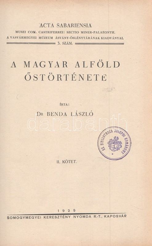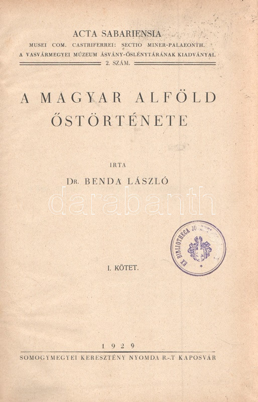 [Bendefy] Benda László: A magyar Alföld őstörténete. I-II. kötet. [Teljes mű, egybekötve.] Kaposvár, 1929. Somogymegyei Keresztény Nyomda Rt. 144 p.; 1 t. (címkép) + [145]-350 + [2] p. Egyetlen kiadás. A Vas megyei születésű Bendefy László (1904-1977) földmérő, geológus, őstörténeti író, a Vas megyei Múzeum ásvány- és őslénytárának rendezője, a baltavári őslénytani ásatás vezetője, a Dunavölfgyi Lecsapoló és Öntöző Vállalat mérnökének geológiai, őslénytani dolgozata a Kisalföld és az Alföld jégkorszaki történetéről, kitekintéssel az itt élt kőkorszaki emberiség életmódjára. Oldalszámozáson belül szövegközti és egész oldalas ábrákkal, rajzokkal, térképvázlatokkal és fényképekkel. (Acta Sabariensis. A Vasvármegyei Múzeum Ásvány-őslénytárásnak kiadványai, 2-3. szám.) Korabeli félvászon kötésben. Jó példány.