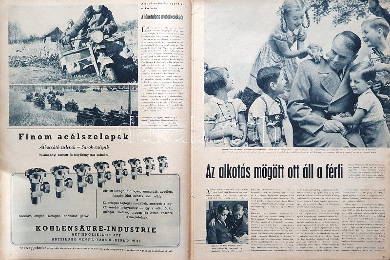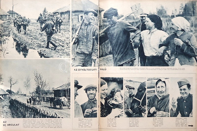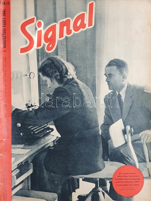 [Folyóirat] Signal. Főszerkesztő: Wilhelm Reetz. Megjelenik 14 naponként. 4. évfolyam, 15. szám. (1943. augusztusi 1. szám.) [Magyarra fordított, illusztrált német háborús folyóirat.] Berlin, 1943. Deutscher Verlag und Druckerei. Folio. 39 + [1] p. A Berlinben szerkesztett, német szerzők által írt, a németek által megszállt országokban és a németekkel szövetséges országokban terjesztett, gazdagon illusztrált, kezdetben kétnyelvű, jelen lapszámunkban már teljesen magyar nyelvű háborús propaganda folyóirat értelemszerűen a tengelyhatalmak háborús felkészültségét méltatja, a német hadiipar méltatásával. A belív nyolc oldala színes felvételeket tartalmaz. Lapszámunk kiemelten foglalkozik Alfred Speer birodalmi hadfelszerelési és hadianyaggyártási miniszter feladatkörével és személyével, valamint bemutat egy, korábban szovjet, jelenleg jó egy éve német fennhatóság alatt álló orosz falut, különös tekintettel a falu újjáéledésére és az ottani nagyszerű új életre. Lapszámunk szigorú értelemben vett háborús riportot nem tartalmaz, ellenben hosszasan elemzi a tengelyhatalmak által ellenőrzött Balkán bevehetetlen mivoltát. Folyóiratunk értelemszerűen szerepel az Ideiglenes Nemzeti Kormány által 1945-ben betiltott művek jegyzékén. Példányunk fűzése meglazult. Fűzve, kétszínnyomású, illusztrált, enyhén sérült kiadói borítóban. Jó példány.