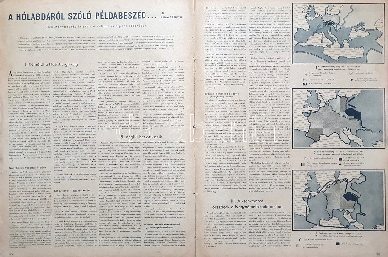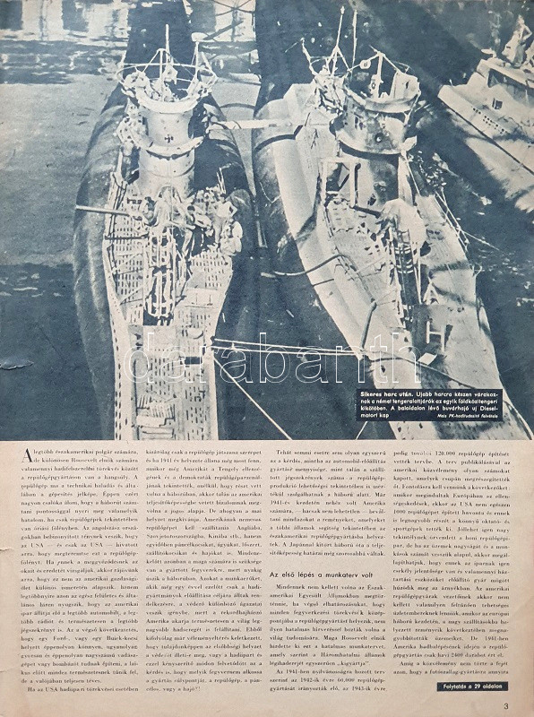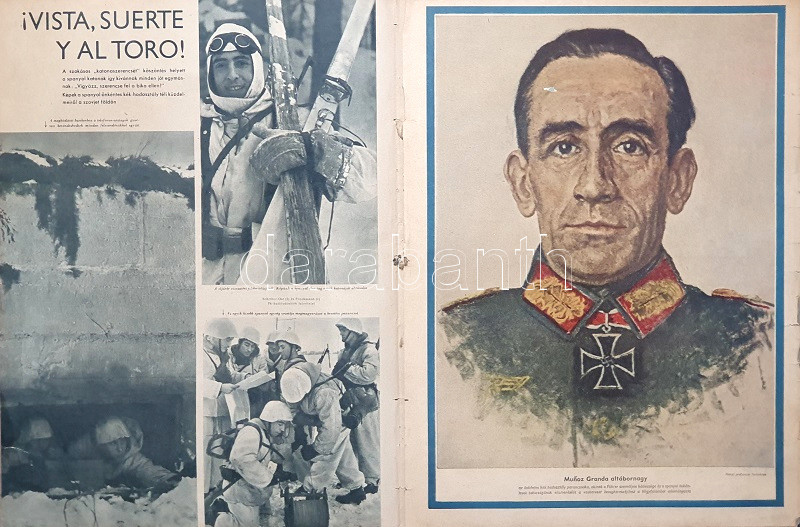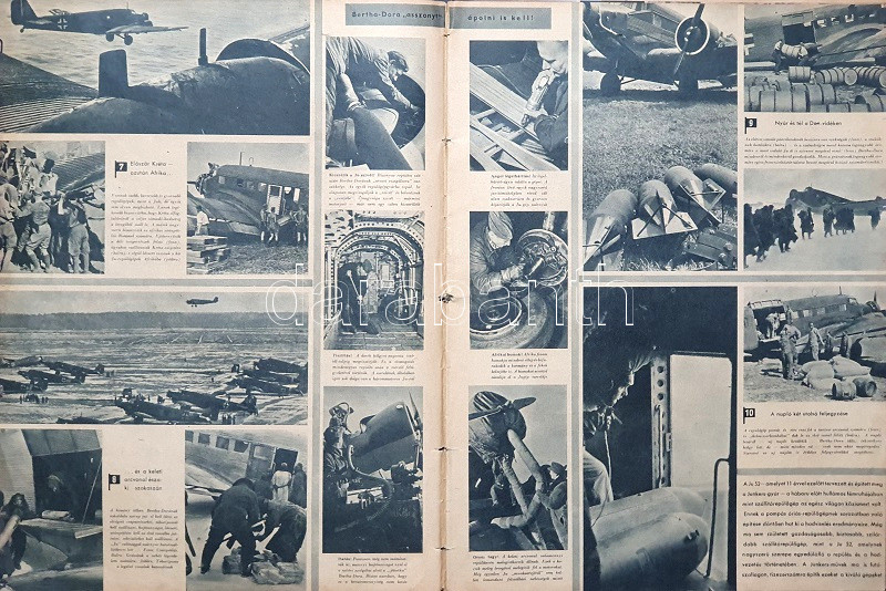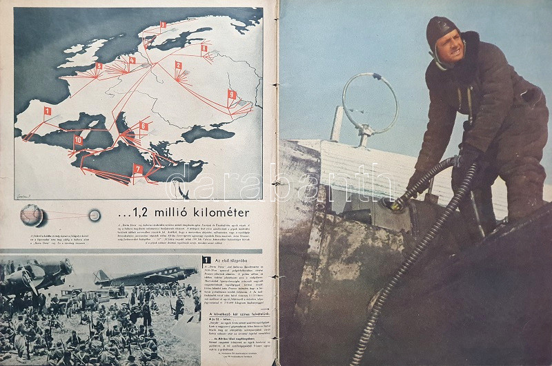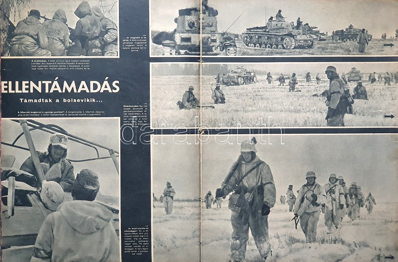 [Folyóirat] Signal. Főszerkesztő: Wilhelm Reetz. Megjelenik 14 naponként. 4. évfolyam, 4. szám. (1943. februári 2. szám.) [Német-magyar nyelvű, illusztrált háborús folyóirat.] Berlin, 1943. Deutscher Verlag und Druckerei. Folio. 35 + [3] p. A Berlinben szerkesztett, német szerzők által írt, a németek által megszállt országokban és a németekkel szövetséges országokban terjesztett, gazdagon illusztrált, kétnyelvű háborús propaganda folyóirat értelemszerűen a tengelyhatalmak háborús felkészültségét méltatja, háborús életképek és a német hadiipar nagy pillanatainak bemutatásával. A belív nyolc oldala színes felvételeket tartalmaz. Folyóiratszámunk cikkei a haditechnikai és hadiipari tájékoztatáson kívül két nagyobb témát tárgyalnak: a német helytartóság alatt élő Cseh-Morva Protektorátus új arany életét méltatják számos cikkben, valamint Anglia világhatalmi pozíciójának megrendülését elemzik a hadi és geopolitikai helyzet függvényében. A központi propagandalap magyar változatának jelen számába magyar vonatkozású hír nem jutott - a II. magyar hadsereg egyidejű, tragikus megsemmisüléséről semmilyen propagandalap nem cikkezne. Folyóiratunk értelemszerűen szerepel az Ideiglenes Nemzeti Kormány által 1945-ben betiltott művek jegyzékén. Példányunk fűzése meglazult, első fedőborítója elvált a belívtől. Fűzve, kétszínnyomású, illusztrált, sérült, enyhén hiányos, téves lapszámozású kiadói borítóban, hátsó borító nélkül.