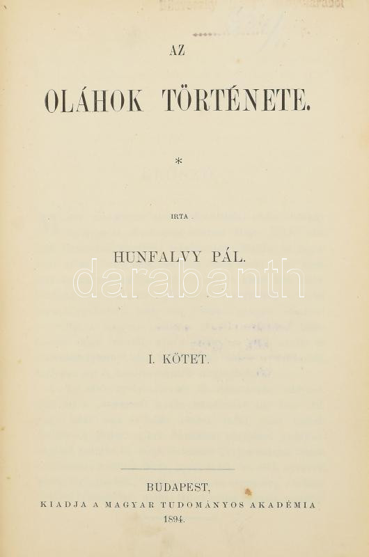 Hunfalvy Pál: Az oláhok története. I. köt. Bp., 1894, MTA (Hornyánszky-ny.), XVI+482+(2)+LXVI+(2) p. Első kiadás. Kiadói aranyozott gerincű egészvászon-kötés, a gerincen kis sérüléssel, kissé foltos lapélekkel, hiányzó előzéklappal.