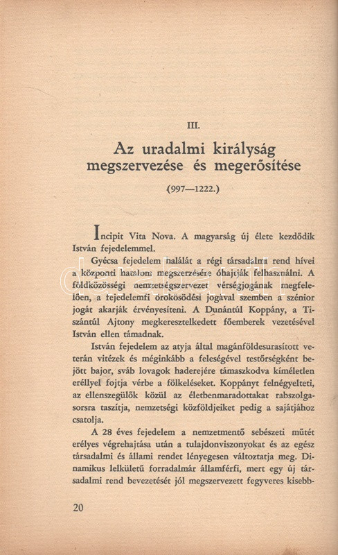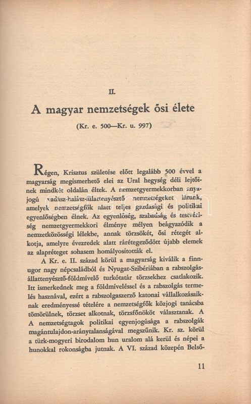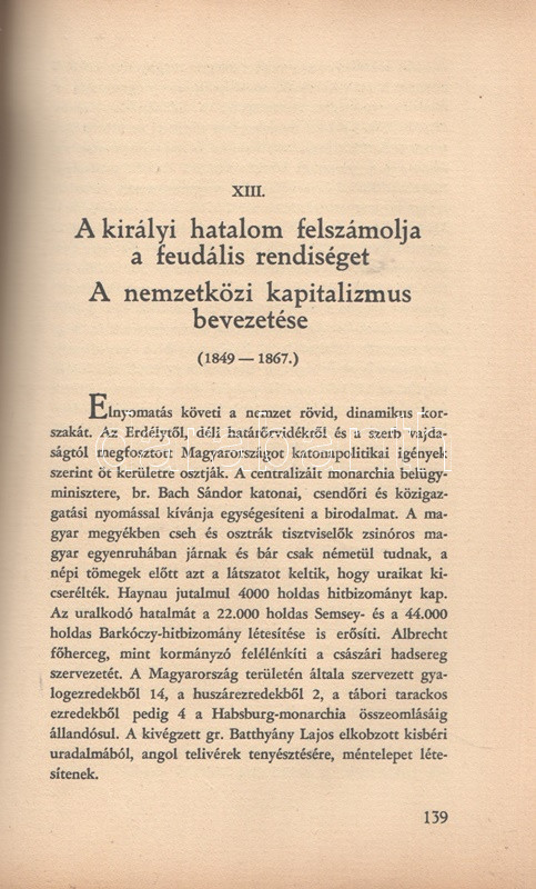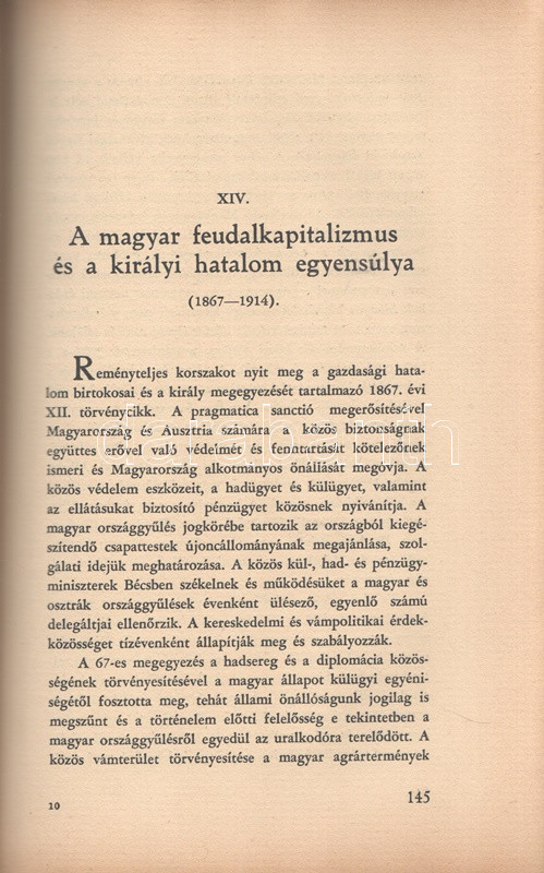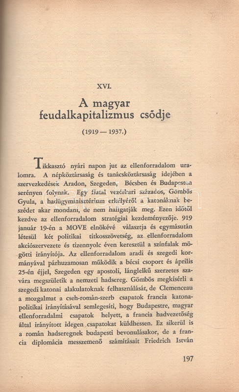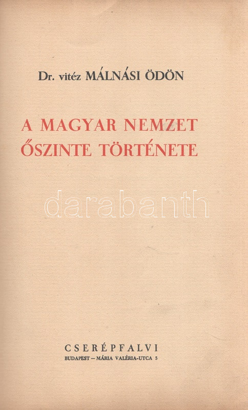 Málnási Ödön, vitéz: A magyar nemzet őszinte története. Budapest, (1937). Cserépfalvi Könyvkiadó (Pápai Ernő Műintézete). 262 + [10] p. Első kiadás. Málnási Ödön (1898-1970) szélsőjobboldali politikus, történész történelmi dolgozata szenvedélyes hangon megírt komoly vádirat a nagybirtok és a nagytőke ellen. Az 1919-es összeomlás idején katonai szolgálatot töltő Málnási Ödönt átvette a Nemzeti Hadsereg, később vitézzé avatták. Az 1920-as években SZDP-tag Málnási Ödön később Szálasi körül tűnt fel, 1937-ben részt vett a nyilas pártok egyesülési aktusán. Málnási Ödön egyéni látásmódú történelmi összefoglalója 1867-től kezdődően keményen ostorozza a szabadelvű rendszer parasztság és munkásság iránti közönyét. A fajelméleti kitérőkkel tarkított dolgozat a Horthy-adminisztrációt csőd felé tartó feudálkapitalizmusnak nevezi, és radikális nemzeti összefogást szorgalmaz az elit uralma helyett. A Szálasiékkal jó kapcsolatokat tartó szerzőt a kötet néhány fejezete miatt perbe fogták és börtönbüntetésre ítélték; a vád szerint a fajelméleti fejtegetéseket tartalmazó kötet nemzetiszocialista szellemben íródott. A szerző következő művéhez: ,,A magyar nemzet őszinte története története történelme pere" című dolgozathoz a nyilas vezér, Szálasi Ferenc írt előszót, ez utóbbi mű, illetve Málnási Ödön további művei rákerültek az Ideiglenes Nemzeti Kormány által 1945-ben betiltott könyvek jegyzékére. Oldalszámozáson belül néhány szövegközti térképvázlattal. Az előzékeken apró javítás. Feliratozott, enyhén sérült kiadói egészvászon kötésben, enyhén foltos lapszélekkel. Jó példány.