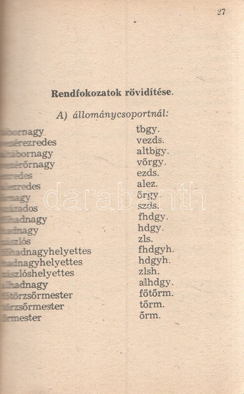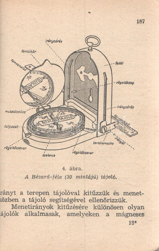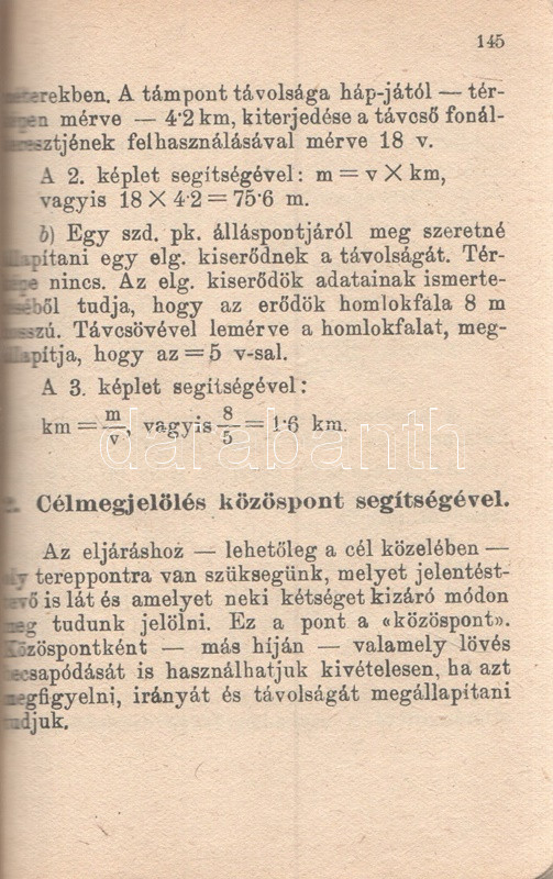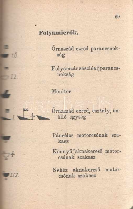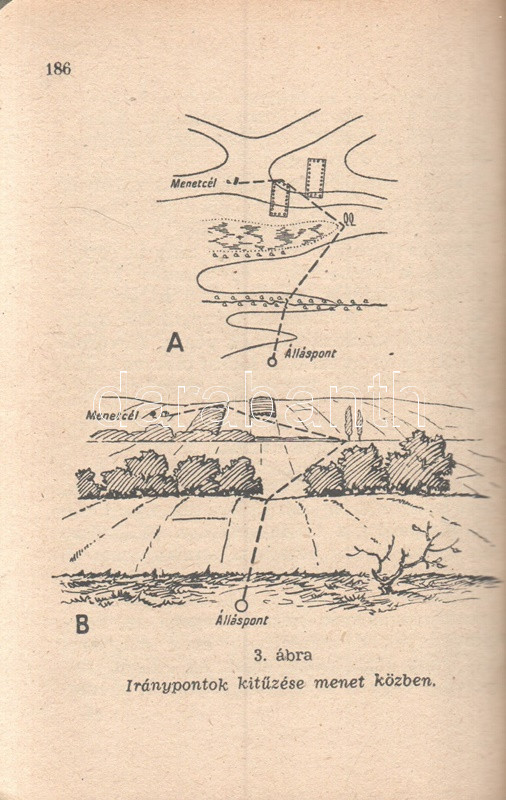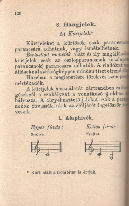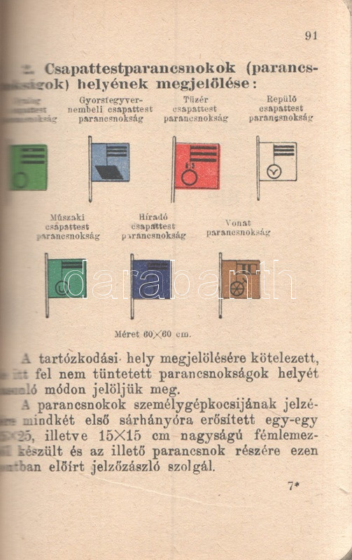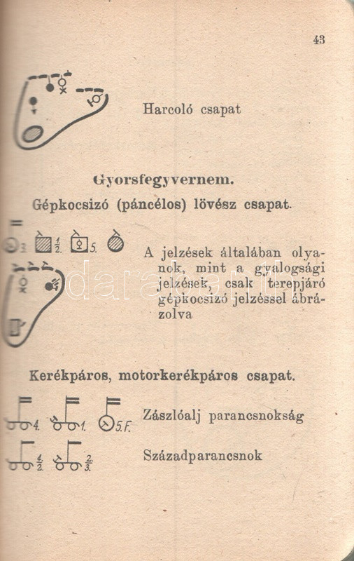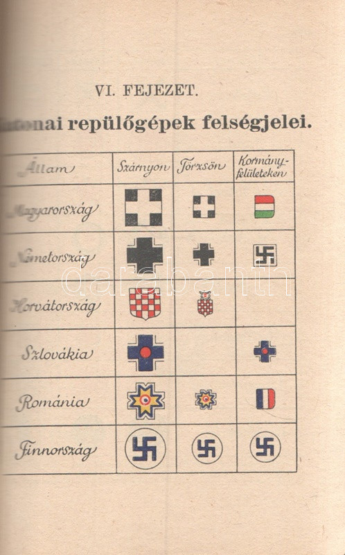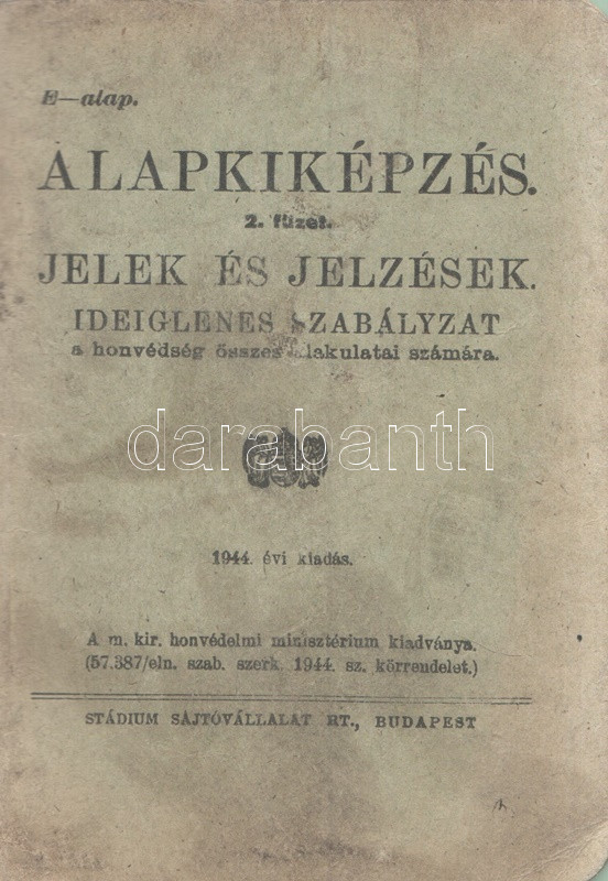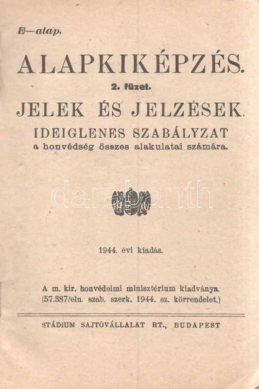 Alapkiképzés. Jelek és jelzések. Ideiglenes szabályzat a honvédség összes alakulatai számára. (2. füzet.) 1944. évi kiadás. Budapest, 1944. Magyar Királyi Honvédelmi Minisztérium - Stádium Sajtóvállalat Rt. 216 p. + 2 t. (kétoldalas) + 1 térkép (szÃnes, kétoldalas). Oldalszámozáson belül szövegközti ábrákkal gazdagon illusztrált szakmunka a katonai vezénylés, katonai térképészet, tájékozódás és hÃrközlés témakörébÅ‘l, a csapattestek, útakadályok, vezénylési mozdulatok, kürtjelzések jelrendszerével, a tengelyhatalmi és szövetséges hatalmi repülÅ‘gépek felségjelzéseinek szÃnes ábráival (melyek közül különösen megdöbbentÅ‘ a finn légierÅ‘ felségjelzése). Fűzve, foltos kiadói borÃtóban.