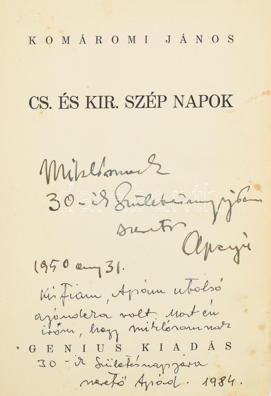 Beschreibung: Komáromi János - Cs. és Kir. szép napok. Bp., é.n., Genius, sérült félvászon kötés. Benne Haranghy Jenő grafikus dedikációja fiának (1950), aki később szintén dedikálta a saját fiának (1984).