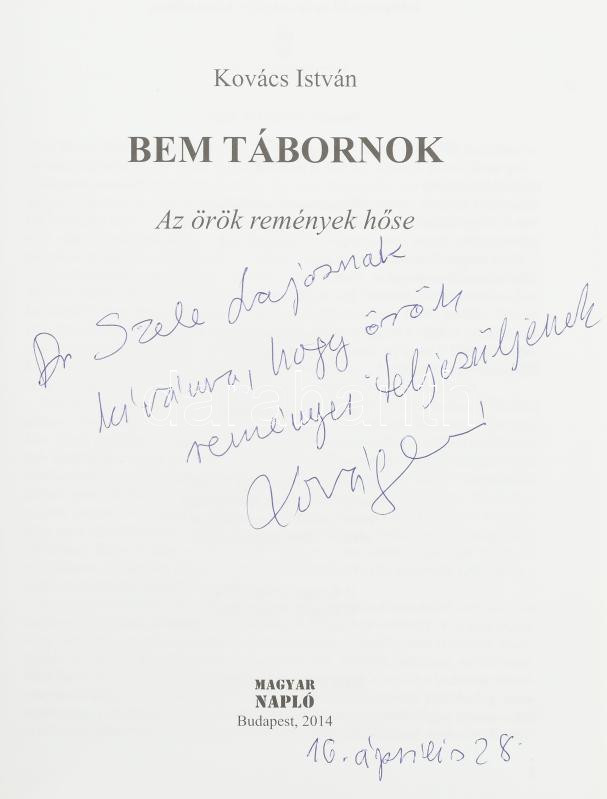 Kovács István: Bem tábornok. Az örök remények hőse. (DEDIKÁLT). Bp., 2014, Magyar Napló. Fekete-fehér képekkel illusztrálva. Kiadói kartonált papírkötés. A szerző, Kovács István (1945- ) Széchenyi- és József Attila-díjas költő, író, műfordító, történész, polonista által DEDIKÁLT példány.