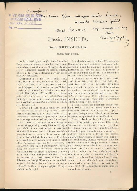 A Magyar Birodalom állatvilága. A Magyar Birodalomból eddig ismert állatok rendszeres lajstroma. III. Arthropoda. (Dedikált!) Bp., 1899, K. M. Természettudományi Társulat (Franklin-ny.), 47+(1) p.+ 1 (színes térkép) t. Magyar és latin nyelven. Kiadói papírkötés, sérült borítóval, régi intézményi bélyegzőkkel, részben szétváló fűzéssel. Az egyik tanulmány szerzője, Pungur Gyula (1843-1907) ornitológus, rovarkutató, természettudós által id. Entz Géza (1842-1919) biológus, zoológus, műegyetemi tanár részére dedikált példány.
