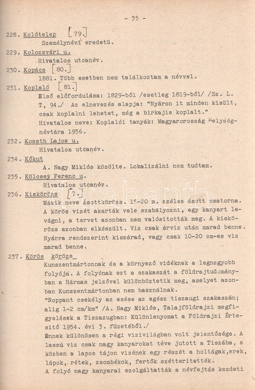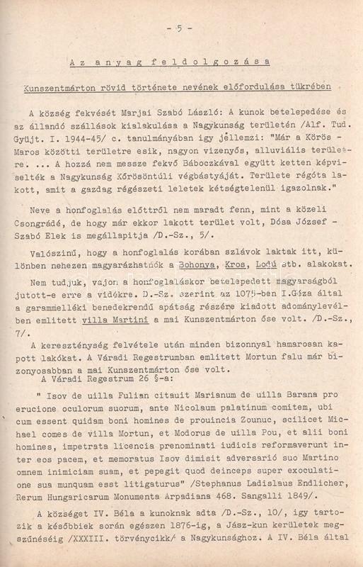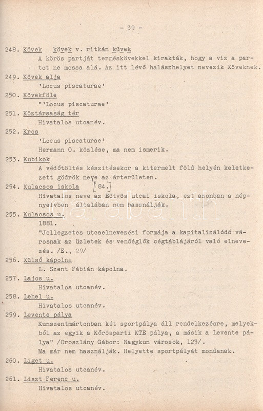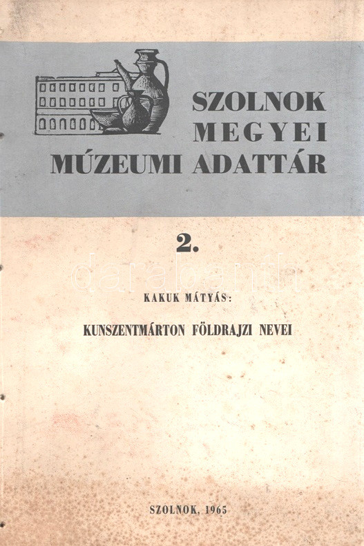 Kakuk Mátyás: Kunszentmárton földrajzi nevei. Szolnok, 1965. Szolnok megyei Tanács VB. rotaprint nyomdája. [4] + 90 p. + 1 t. (kihajtható). Egyetlen kiadás. Az 1964. évi Országos Néprajzi és Nyelvjárásgyűjtő Pályázaton 1. díjat nyert helynévtörténeti dolgozat összesen 500 példányban készült. A több éves nyelvjáráskutató munka helyi adatközlők és levéltári kutatások alapján állt össze, és érdekes képet ad a hivatalos és a valóban használt helyi földrajzi névanyag eltéréseiről. A dolgozat állítása szerint egyes, a háború előtt használatos földrajzi nevek (levente pálya, kaszinó) a társadalmi változásokkal párhuzamosan kikopóban vannak; hogy az állításnak cenzurális okai vannak, vagy valóban ilyen jellegű folyamatok zajlottak az 1960-as években, nem tudhatjuk. A kihajtható térképen Kunszentmiklós belterülete. (Szolnok megyei múzeumi adattár, 2. szám.) Fűzve, illusztrált, enyhén elszíneződött kiadói borítóban. Jó példány.