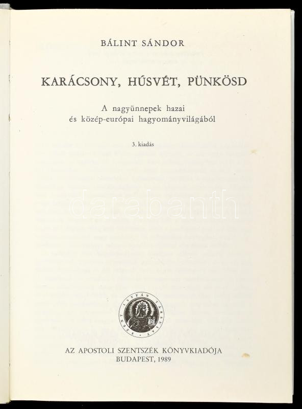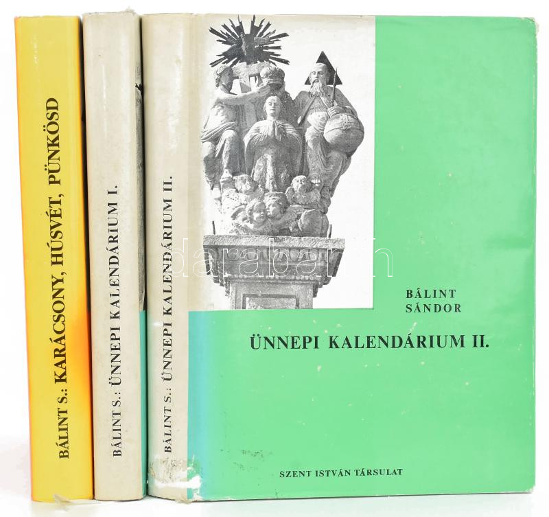 Bálint Sándor 2 műve: Ünnepi kalendárium I-II. köt. A Mária-ünnepek és jelesebb napok hazai és közép-európai hagyományvilágából. I. köt.: december 1. - június 30. II. köt.: július 1- november 30. Bp., 1977, Szent István-Társulat, 527+1; 561+1 p. Első kiadás. Kiadói egészvászon kötésben, kiadói papír védőborítóban, a papírborítókon kopásnyomokkal, az I. kötet címkével, a II. kötet gerincén kis sérüléssel, intézményi bélyegzővel.; Karácsony, húsvét, pünkösd. A nagyünnepek hazai és közép-európai hagyományvilágából. Bp., 1989, Szent István-Társulat, 403+1 p. Harmadik kiadás. Kiadói egészvászon kötésben, kiadói kissé szakadt papír védőborítóban, papírborítón kis kopásnyomokkal.