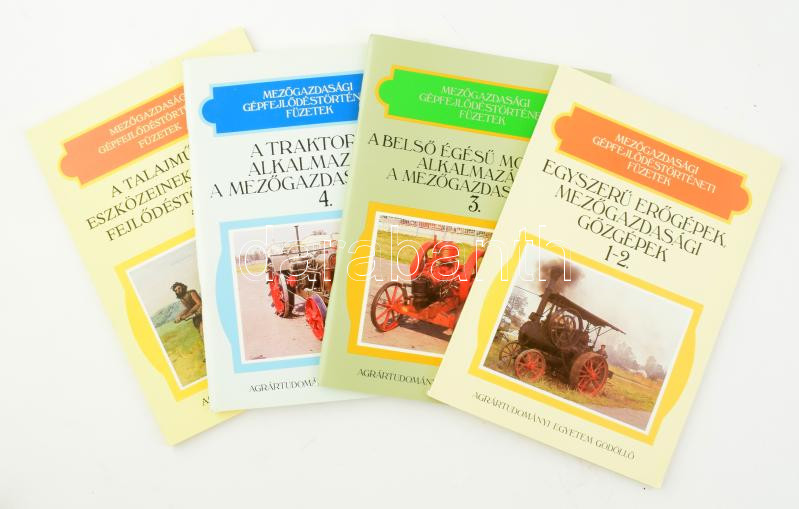 Mezőgazdasági gépfejlődéstörténeti füzetek 1-5. (4 kötet): Egyszerű erőgépek, mezőgazdasági gőzgépek.; A belső égésű motorok alkalmazása a mezőgazdaságban.; A traktorok alkalmazása a mezőgazdaságban.; A talajművelés eszközeinek, gépeinek fejlődéstörténete. Gödöllő, (1989-1990), Agrártudományi Egyetem. Kiadói papírkötés.