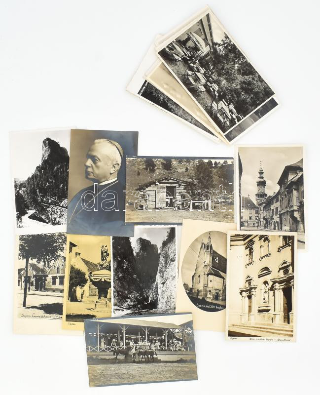 Beschreibung: 20 darab régebbi fotólap, közte soproni utcaképekkel és erdélyi tájakat ábrázoló darabokkal, néhány hátulján felragasztás nyoma