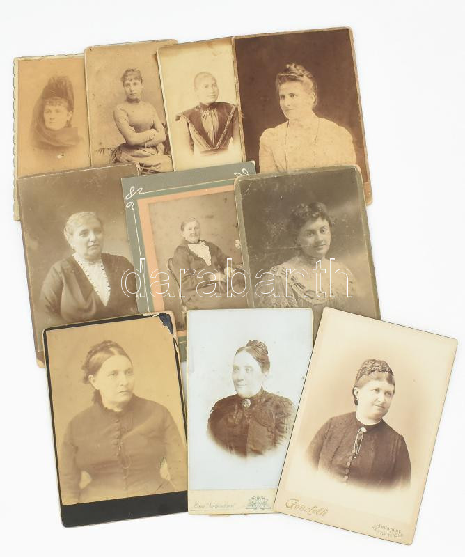 cca 1880-1910 Hölgyportrék, 10 db keményhátú fotó klf. műtermekből (Koller Károly, Mai és Társa, Brenner és Erdős, stb.), változó állapotban, 14,5x7 cm és 17x11 cm között