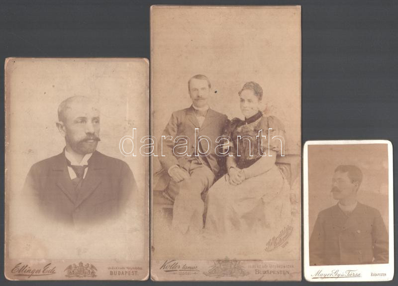 cca 1890-1900 3 db keményhátú portré fotó, budapesti műtermekből (Koller tanár utódai, Mayer Gy és Társa, Ellinger Ede), mindegyik kopott, 10,5x7 és 20,5x11 cm közötti méretekben