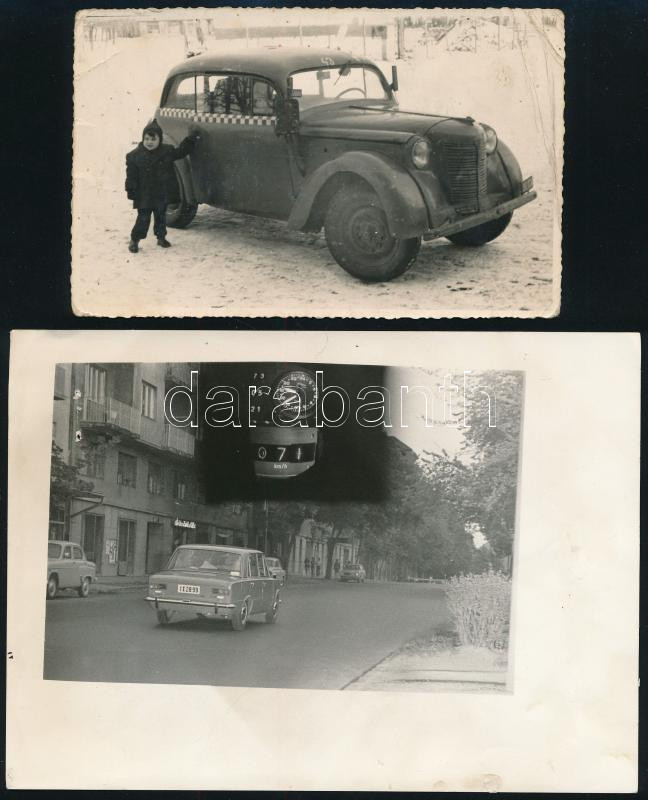 cca 1930-1940 Régi taxiról készült fotó, törésnyomokkal, 14x8,5 cm + cca 1980 Rendőrségi traffipax felvétel egy gyorshajtó "kocka Lada" autóról, 18x13 cm