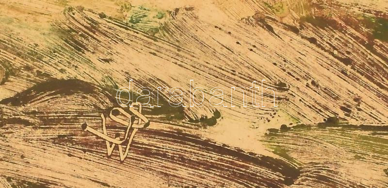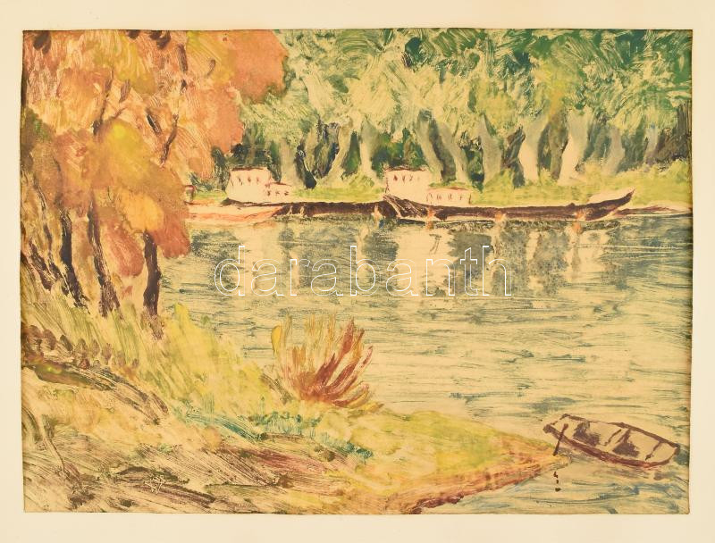 Csabai Wágner József (1888-1967): Uszályok a Bodrogon. Monotípia, papír, jelezve balra lent, hátoldalán a művész bélyegzőjével és autográf feliratával, paszpartuban, 27,5×37,5 cm