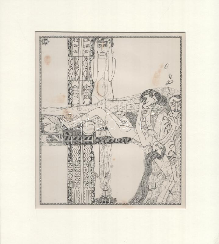Beschreibung: Kozma Lajos (1884-1948): Élet. Cinkográfia, papír, jelzett a cinkográfián, paszpartuban, foltos, 20×17 cm