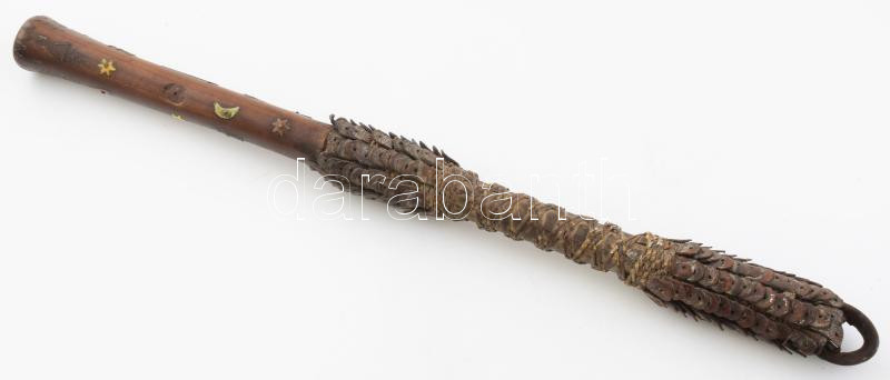 Beschreibung: 1912 Évszámos ösztöke, csikóterelő. Fém rátét, bőr, fa.