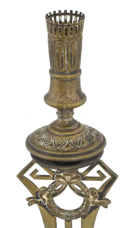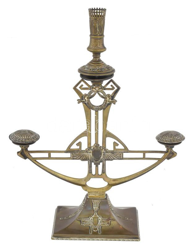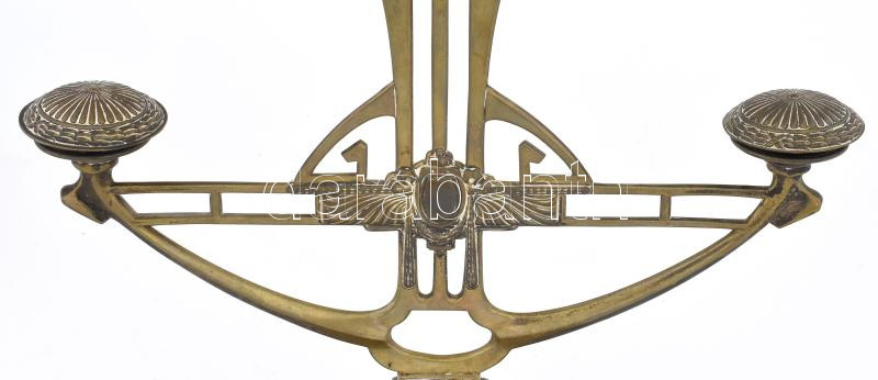 Beschreibung: Argentor art nouveau ezüstözött alpakka gyertyatartó. Jelzett, kopott, rendkívül díszes, m: 41 cm