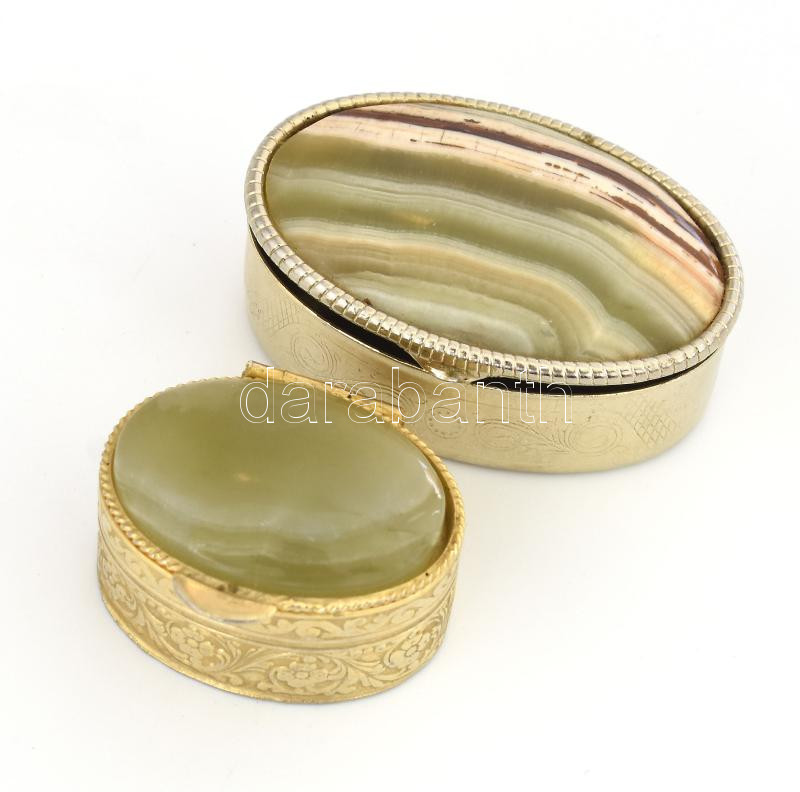 2 darab gyűrűtartó szelence, ónix rárakással, h: 3,5-5 cm https://www.darabanth.com/de/473-Fernauktion/473.0/Kunst-Dokumente-andere-Sammelgebiete/Design-Mode~500014/2-darab-gyurutarto-szelence-onix-rarakassal-h-3-5-5-cm~II3210557
