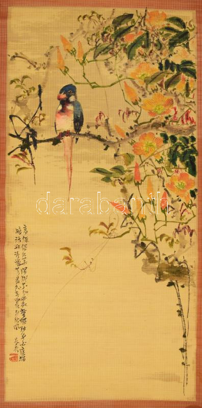 Beschreibung: Kínai festett falikép, porcelán súlyozókkal, cca 155x54 cm