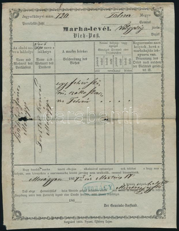 1867 Marhalevél, Mórágy bélyegzéssel https://www.darabanth.com/de/473-Fernauktion/473.0/Kunst-Dokumente-andere-Sammelgebiete/Dokument~500022/1867-Marhalevel-Moragy-belyegzessel~II3199939