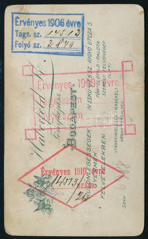 1906-1910 Vizitkártya fotó mint állandó belépőjegy a Dunafürdőbe (Ferencz József Kórház), hátoldalon több évenkénti érvényesítő pecséttel, tulajdonosi aláírással, 10,5×6,5 cm
