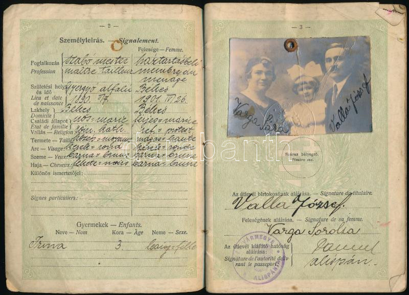 1928 A Magyar Királyság által kiállított fényképes útlevél Valla József gyergyóalfalvi születésű békési lakos és felesége részére, magyar és román bejegyzésekkel, bélyegekkel