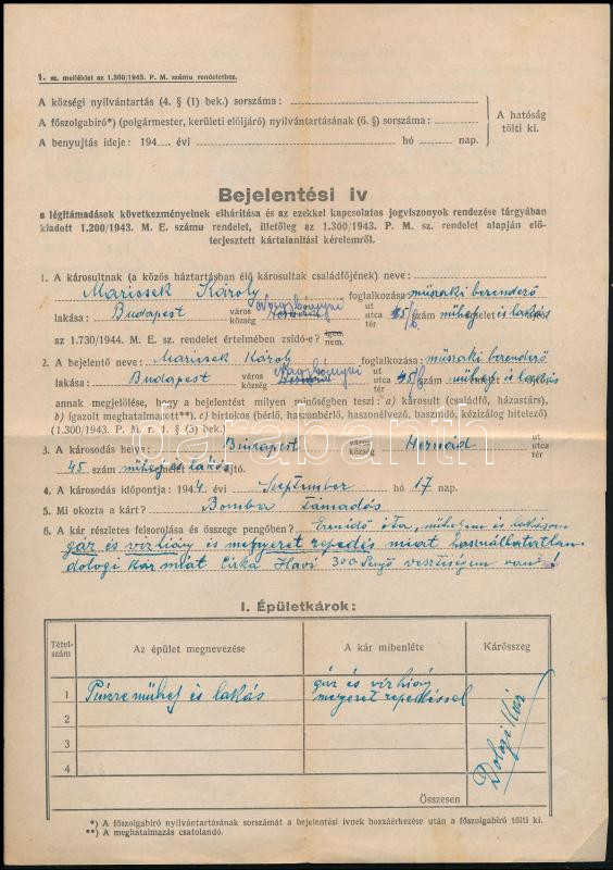 Beschreibung: 1944 Budapesti bombatámadás bejelentési íve a károkról