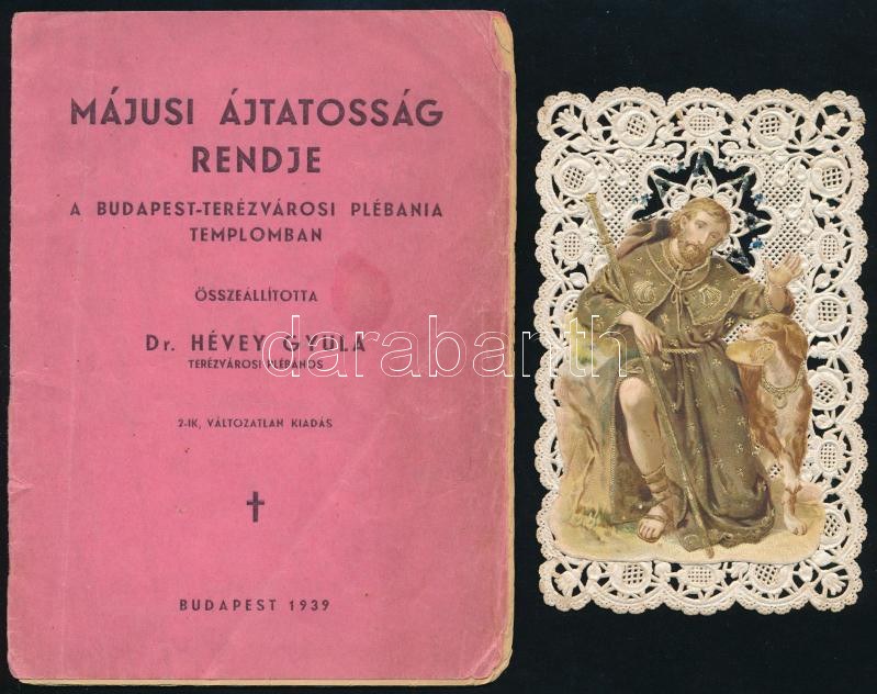 1939 Májusi ájtatosság rendje a Budapest-Terézvárosi Plébániatemplomban. Összeáll.: Dr. Hévey Gyula. Bp., Sárkány-ny., 20 p. Tűzött papírkötés, sérült, különvált borítóval. + Szent Rókus, csipkés litho szentkép, 10,5x6,5 cm