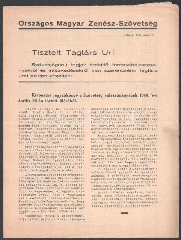 1940 Az Országos Magyar Zenész-Szövetség körlevele a tagokat érintő eseményekről és intézkedésekről, benne a zsidótörvényekkel kapcsolatos tájékoztatás, 4 sztl. lev.