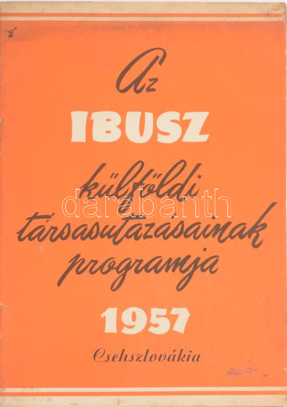 1957 Az IBUSZ külföldi társasutazásainak programja - I. Csehszlovákia,... https://www.darabanth.com/de/473-Fernauktion/473.0/Kunst-Dokumente-andere-Sammelgebiete/Drucksachen~1000013/1957-Az-IBUSZ-kulfoldi-tarsasutazasainak-programja-I-Csehszlovakia-ismerteto-prospektus-t~II3184896