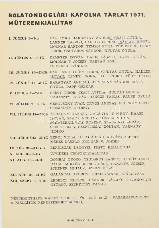 Balatonboglári Kápolna Tárlat 1971. műteremkiállítás kétoldalas ismert... https://www.darabanth.com/de/473-Fernauktion/473.0/Kunst-Dokumente-andere-Sammelgebiete/Drucksachen~1000013/Balatonboglari-Kapolna-Tarlat-1971-muteremkiallitas-ketoldalas-ismertetoje-alahuzasokk~II3210137