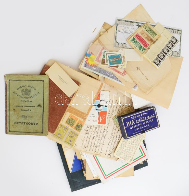 Beschreibung: cca 1880-1945 Vegyes papírrégiségek, okmánybélyeg, reklám, numizmatikai vonatkozású tételek, stb