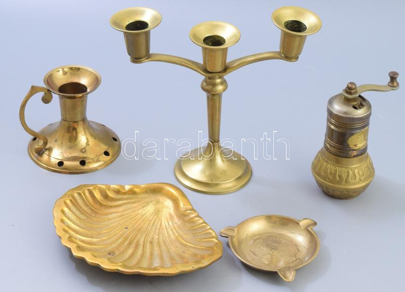 Beschreibung: 5 darab bronz tárgy, gyertyatartó, hamuzó, borsdaráló, tálka.