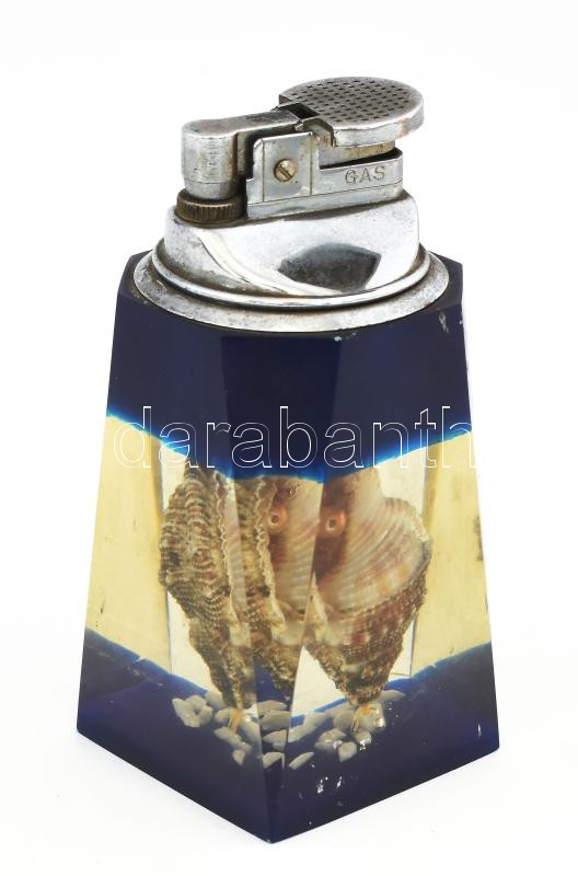 Beschreibung: Asztali öngyújtó tengeri csiga díszítéssel, nincs feltöltve, kis sérülésekkel, m: 10,5 cm