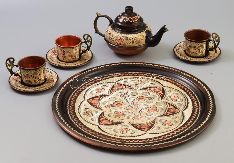Beschreibung: Díszes réz 3 személyes kávézó készlet, tálcán, kis deformálódással, d: 29 cm