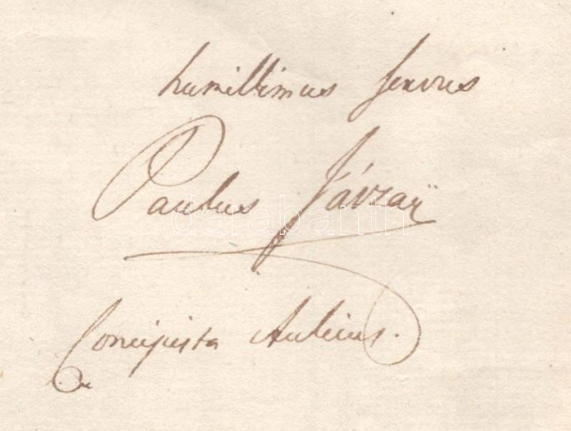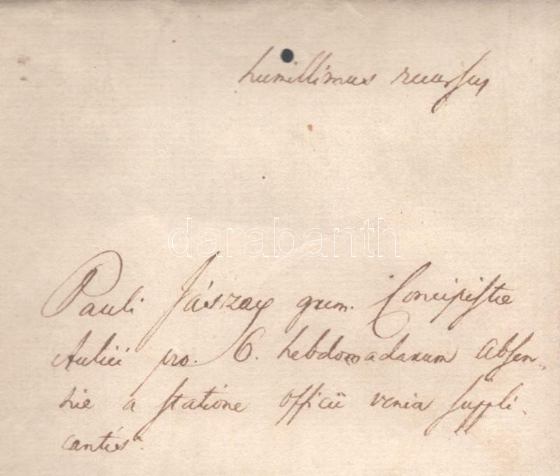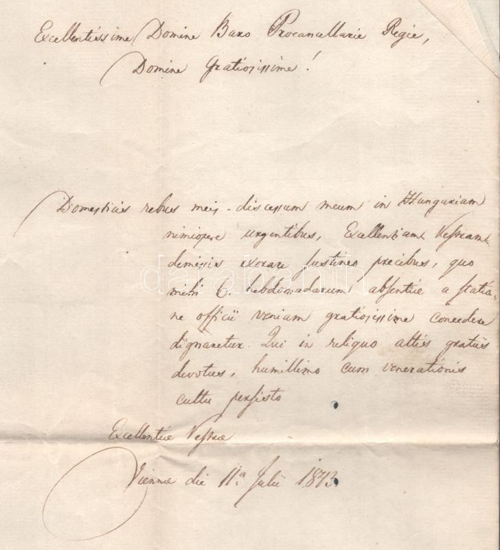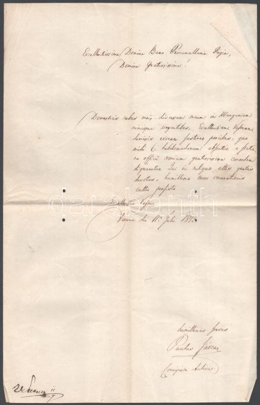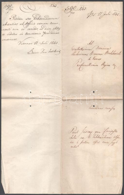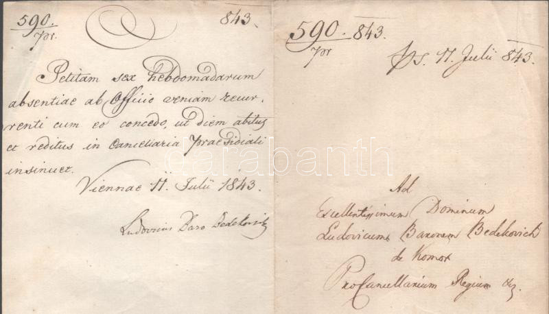 1843 Hivatal elhagyási engedély Bedekovich Lajos (1784-1854) alkancellár, főispán saját kezű aláírásával Jászay Pál (1809-1852.) történész, diplomatikus (oklevélkutató), nyelvtörténész, jogász, részére az ő aláírásával is