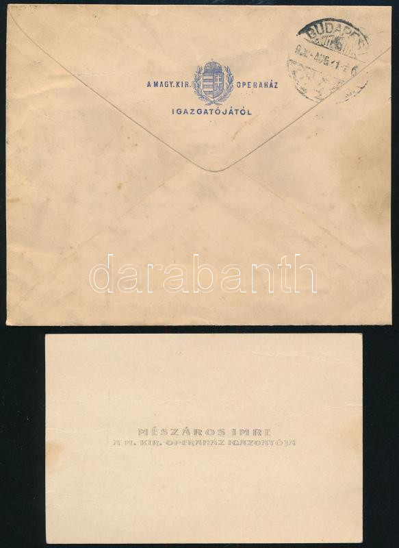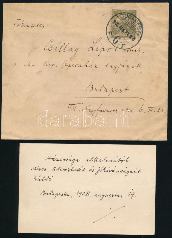 1908 Mészáros Imre (1860-1913) a M. Kir. Operaház igazgatója, hegedűművész névjegykártyáján, saját kézzel írt borítékon gratuláló jókívánságok Csillag Lipótnak, az Operaház tagjának házasságkötése alkalmából