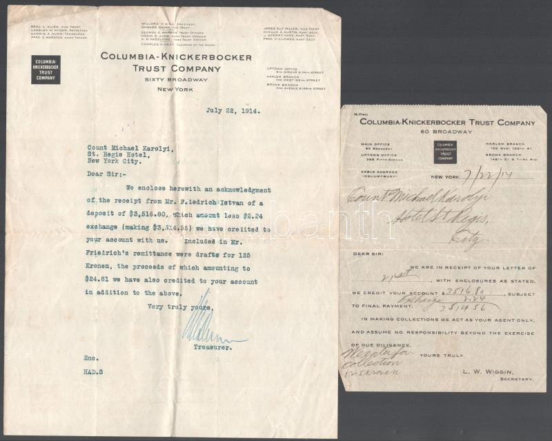 Beschreibung: 1914 Károlyi Mihály részére kiadott elismervény és levél Friedrich István által részére elhelyezett összeg jóváírásáról amerikai bankszámlán