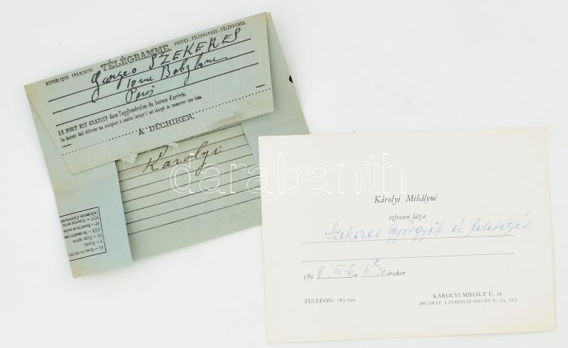 1947 Párizs, Károlyi Mihályné Andrássy Katinka (1892-1985) francia nyelvű távirata Szekeres György (1914-1973) újságíró, műfordító, később az Európa Kiadó főszerkesztője részére. + 1966 Károlyi Mihályné Andrássy Katinka (1892-1985) meghívója Szekeres György (1914-1973) újságíró, műfordító, később az Európa Kiadó főszerkesztője és felesége részére.