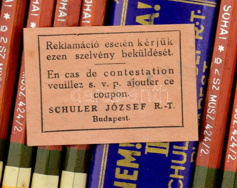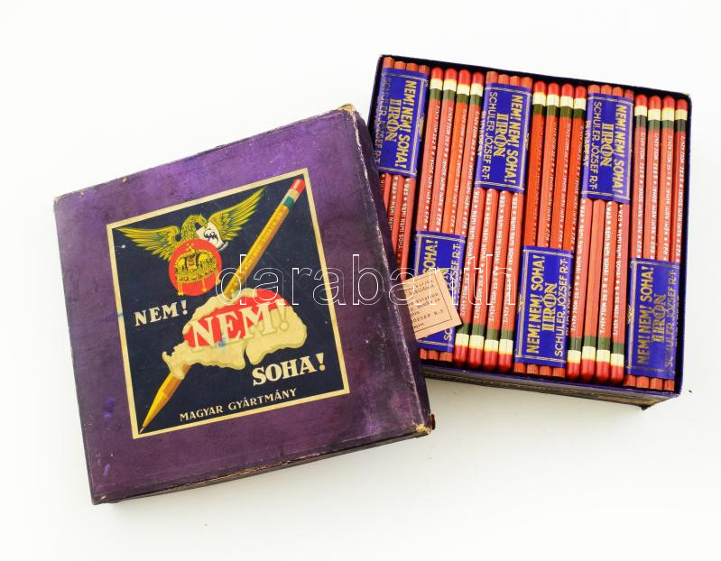 Schuler József R.T. - NEM! NEM! SOHA! irredenta ceruza 1 nagyobb doboz teljes tartalommal, 12 tucat ceruza (144db, 12 x 12db) magyar-francia nyelvű garanciajeggyel; m: 19x19x5cm; szép állapotban; unikális ritkaság!