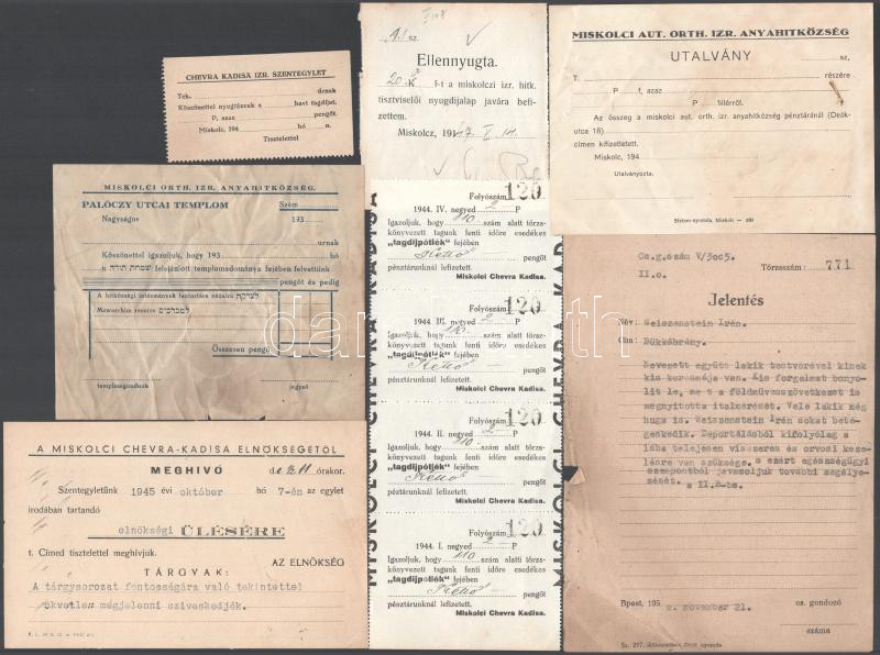 1943-45 A Miskolci Chevra Kadisa nyugta íve és egyéb fejléces okmányai... https://www.darabanth.com/de/473-Fernauktion/473.0/Kunst-Dokumente-andere-Sammelgebiete/Judaica~1000004/1943-45-A-Miskolci-Chevra-Kadisa-nyugta-ive-es-egyeb-fejleces-okmanyai-a-illetve-a-miskolci-zsi~II3196080